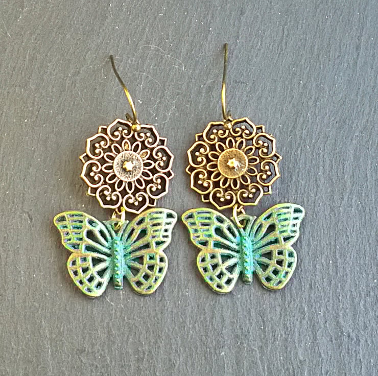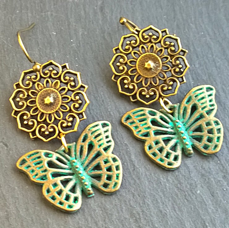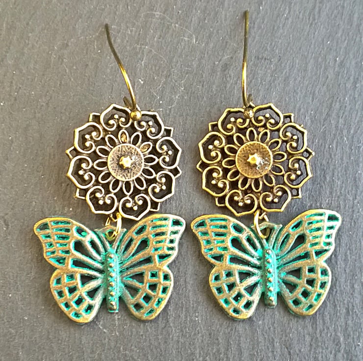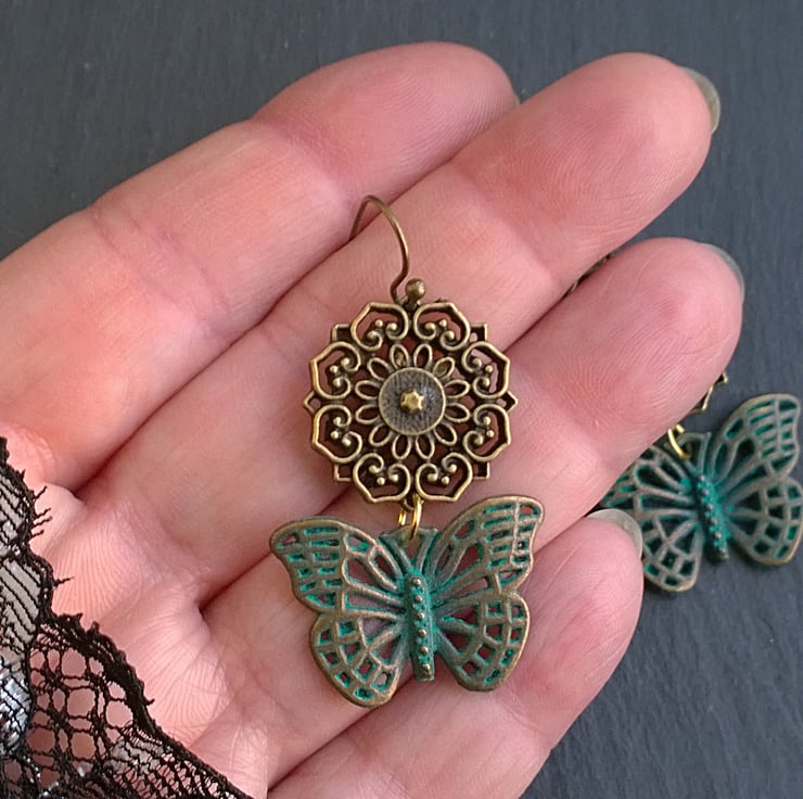 Some pretty earrings with a verdigris patina effect butterfly and a lotus flower style antiqued bronze mandala charm.