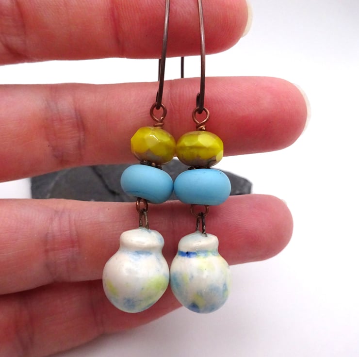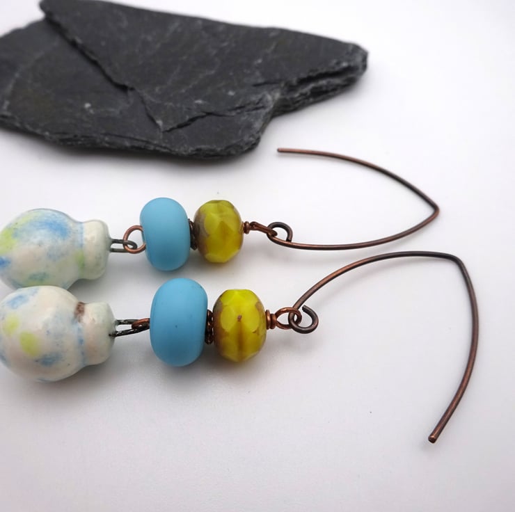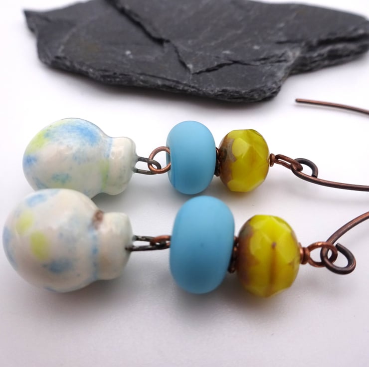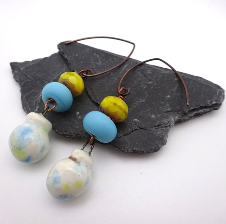 A pair of earrings made with handmade copper ear wires, yellow Czech glass beads, handmade blue lampwork glass beads and handmade ceramic drops.