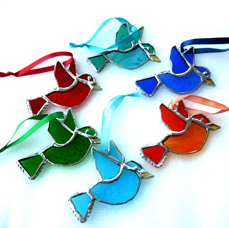 A choice of colour with each bird cut from 2 types and shades of glass and a yellow beak.