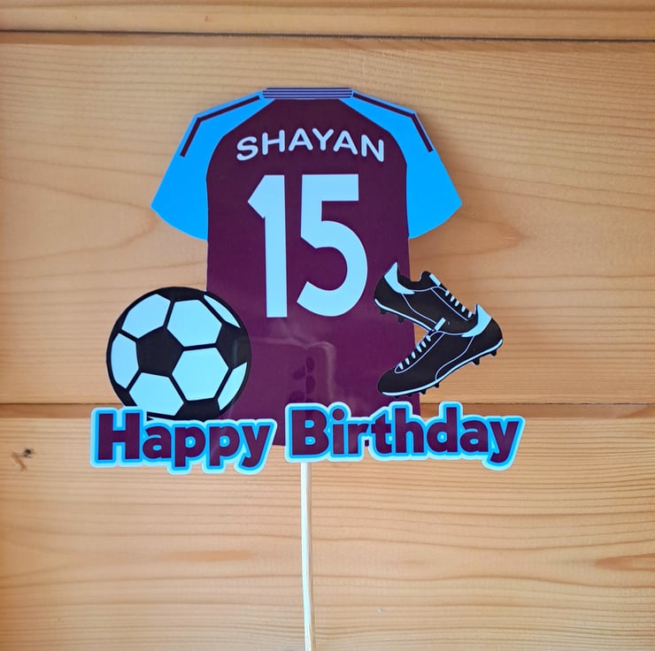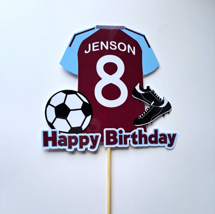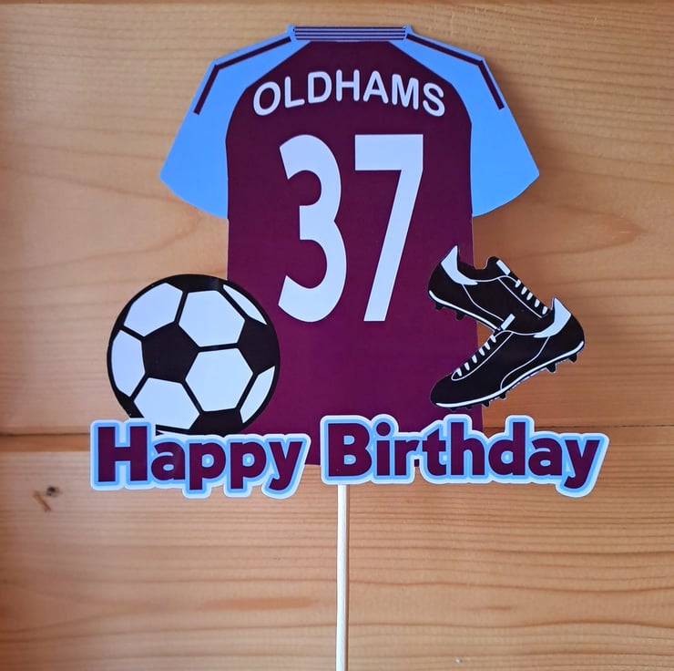 Aston Villa style cake topper personalised.. Printed onto high quality card and laminated for a glossy wipe clean surface. This customised topper is approx.13cm wide x 12cm high to which a food safe skewer will be attached. A perfect cake decoration for football fans and football themed Birthday parties.