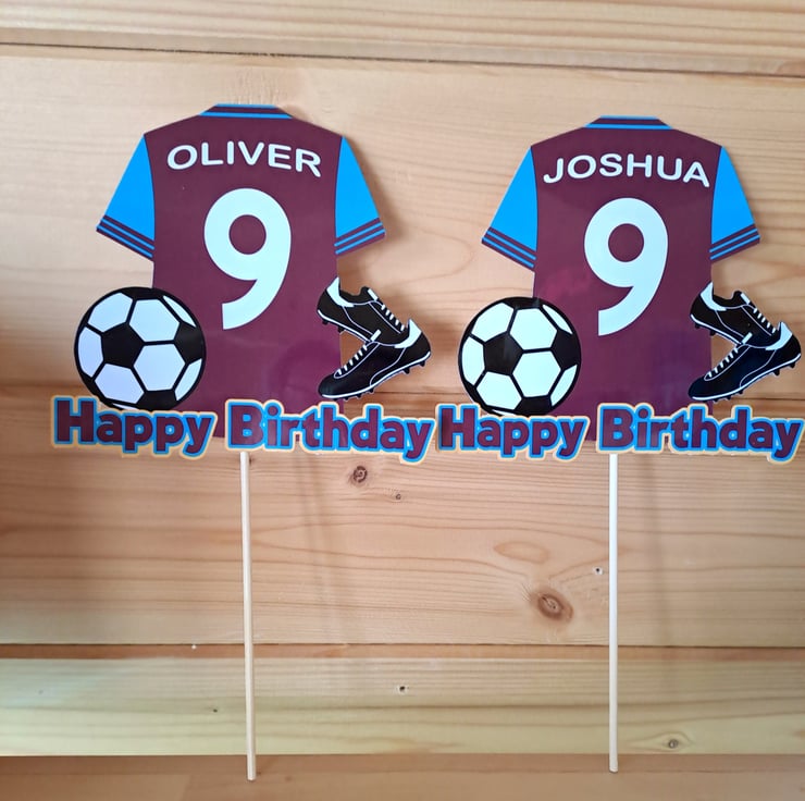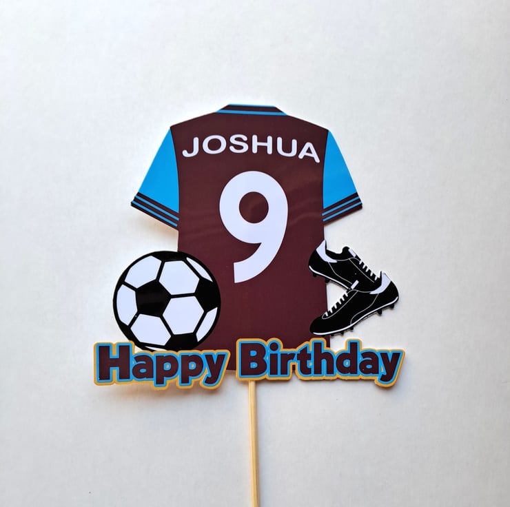 West Ham style cake topper personalised.. Printed onto high quality card and laminated for a glossy wipe clean surface. This customised topper is approx.13cm wide x 12cm high to which a food safe skewer will be attached. A perfect cake decoration for football fans and football themed Birthday parties.