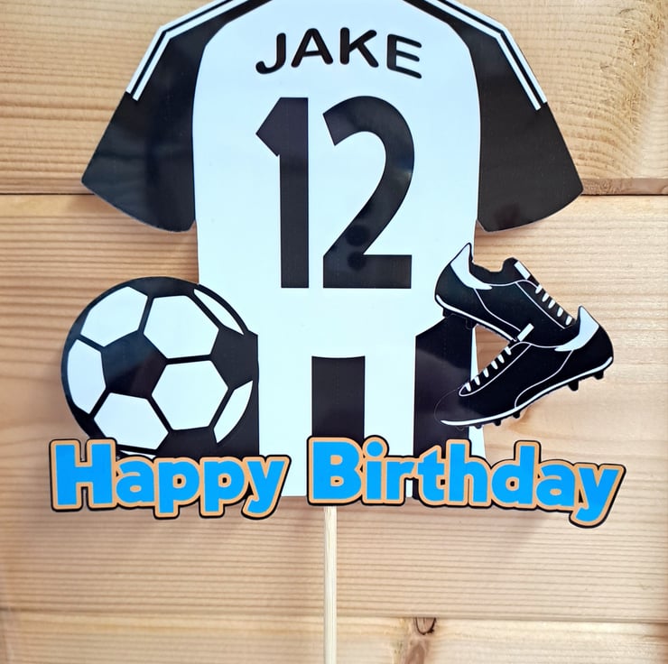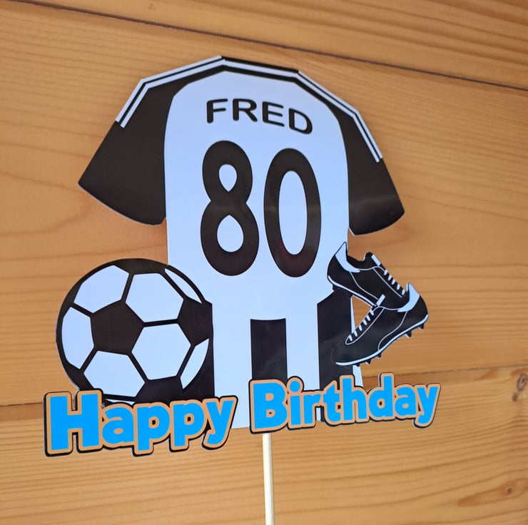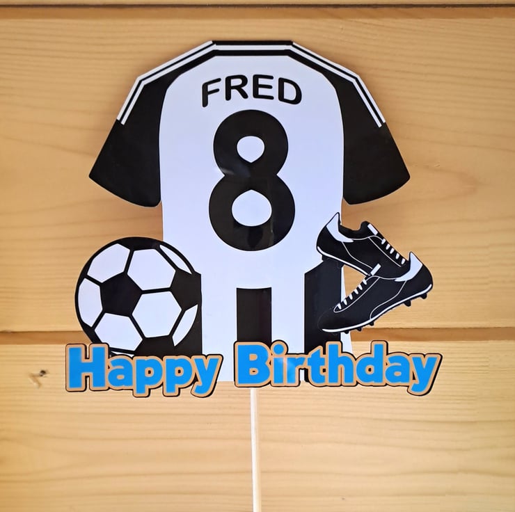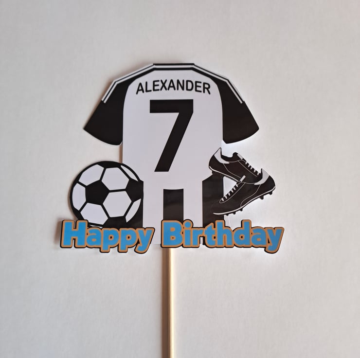 Newcastle style cake topper personalised.. Printed onto high quality card and laminated for a glossy wipe clean surface. This customised topper is approx.13cm wide x 12cm high to which a food safe skewer will be attached. A perfect cake decoration for football fans and football themed Birthday parties.