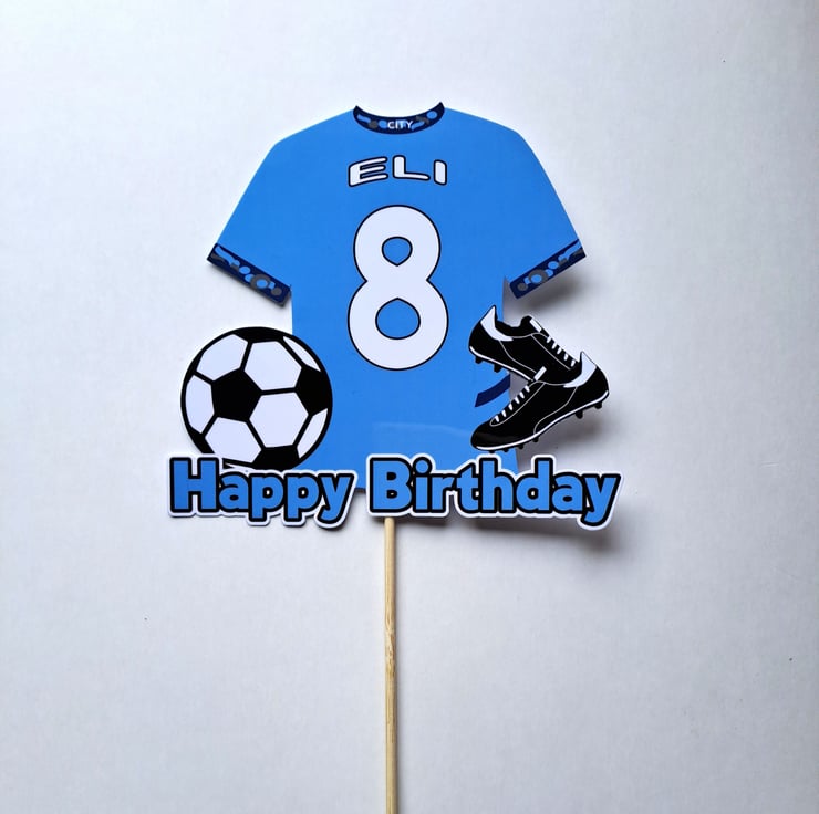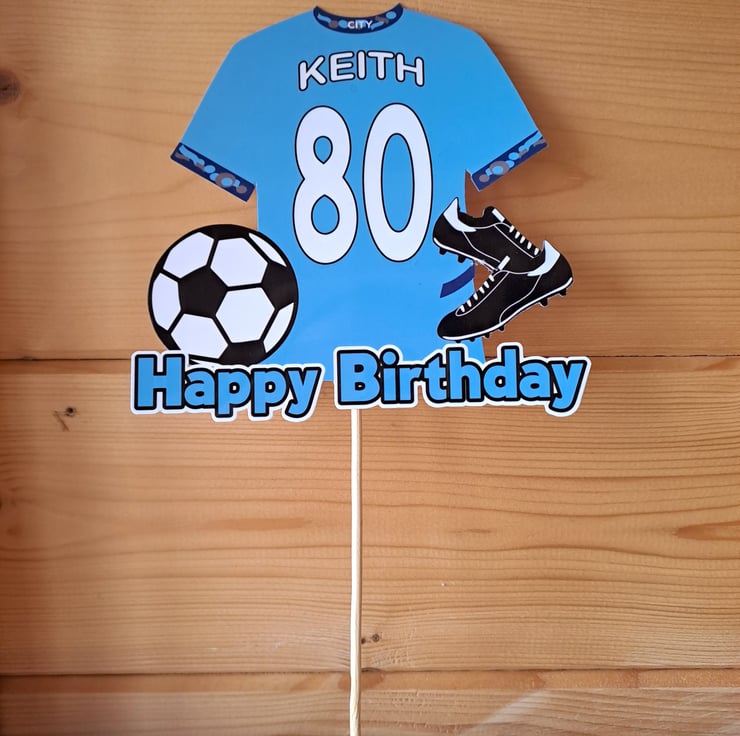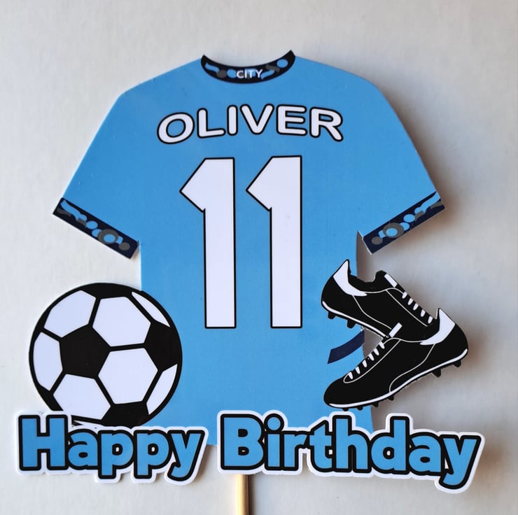 Man City style cake topper personalised.. Printed onto high quality card and laminated for a glossy wipe clean surface. This customised topper is approx.13cm wide x 12cm high to which a food safe skewer will be attached. A perfect cake decoration for football fans and football themed Birthday parties. Manchester City style.