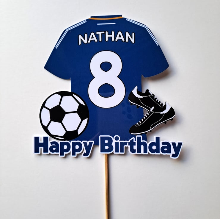 Leicester City style cake topper personalised.. Printed onto high quality card and laminated for a glossy wipe clean surface. This customised topper is approx.13cm wide x 12cm high to which a food safe skewer will be attached. A perfect cake decoration for football fans and football themed Birthday parties.