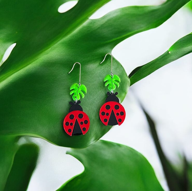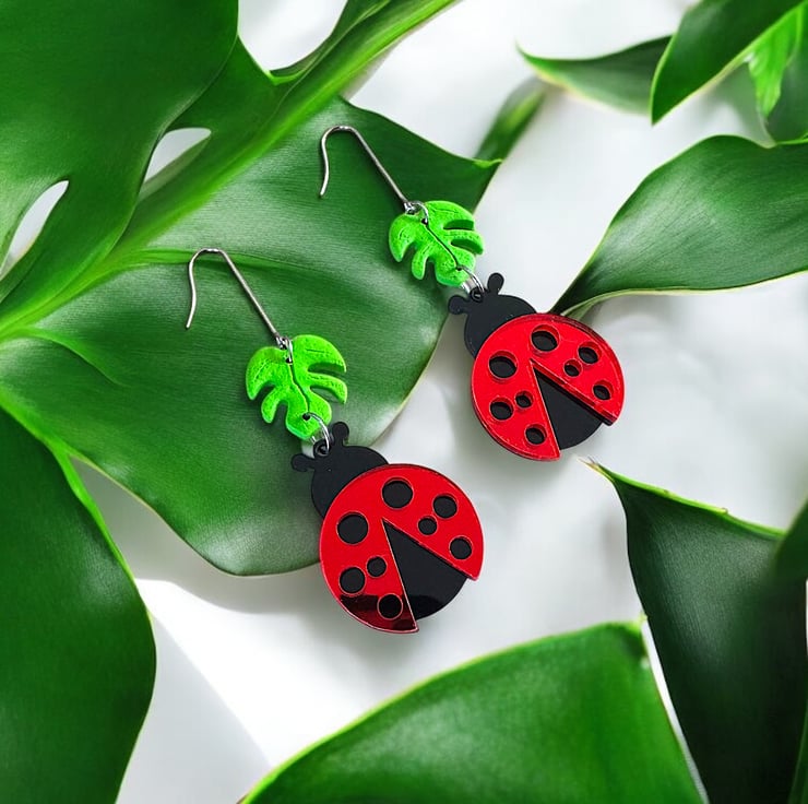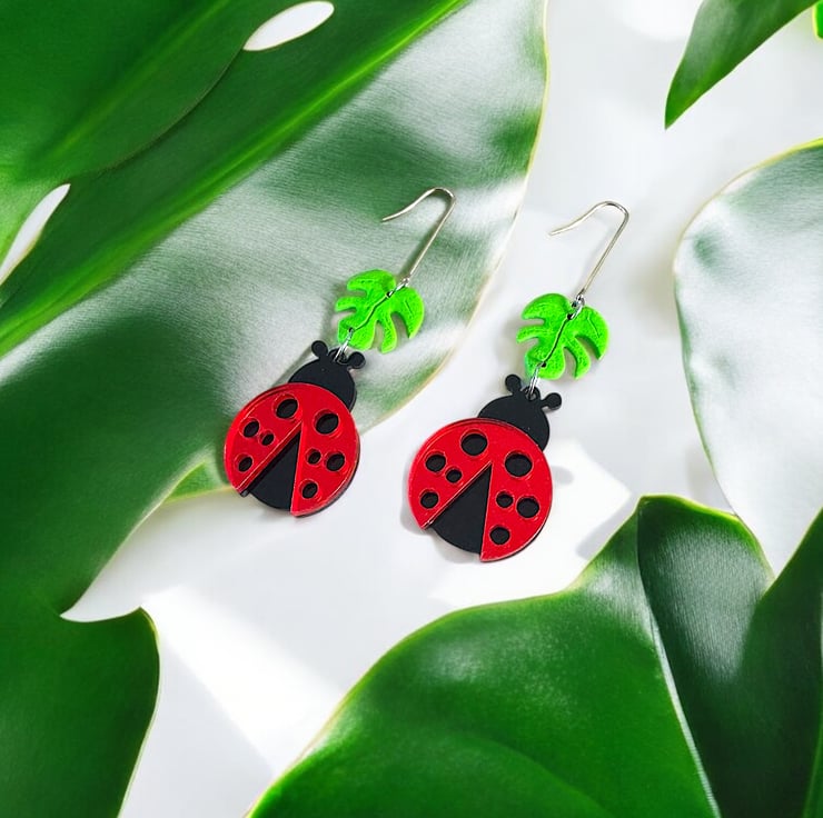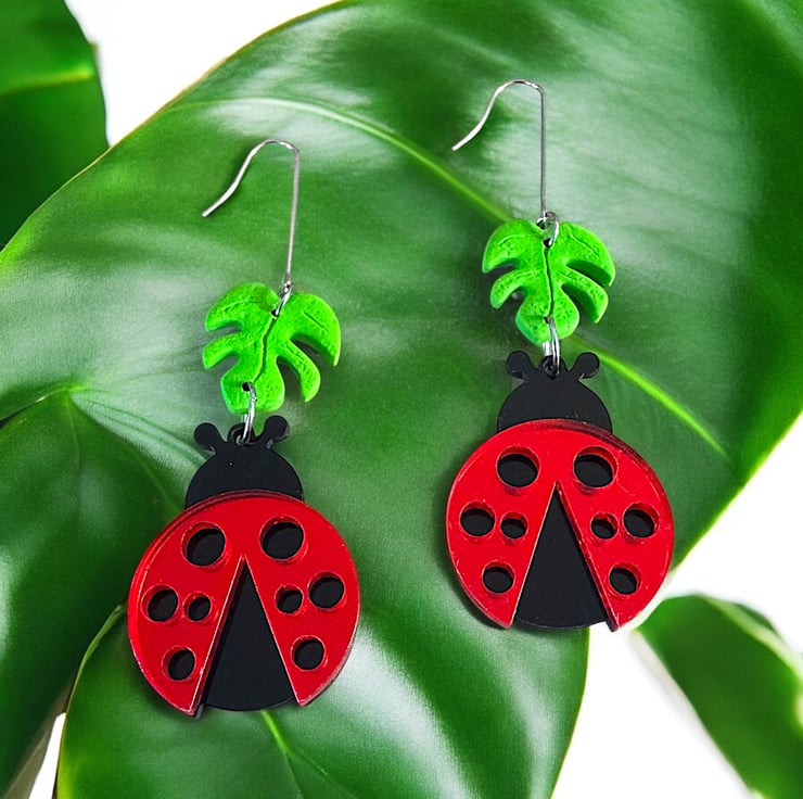 Made from layered Black and Mirrored Red Acrylic with a Bright Green Monstera Polymer clay Leaf with hand marked veins to finish.