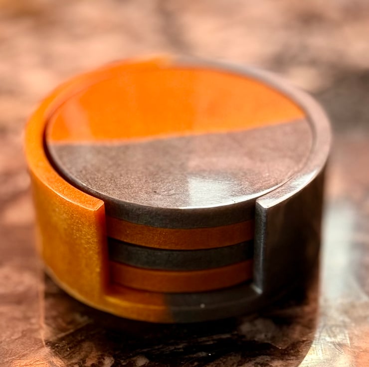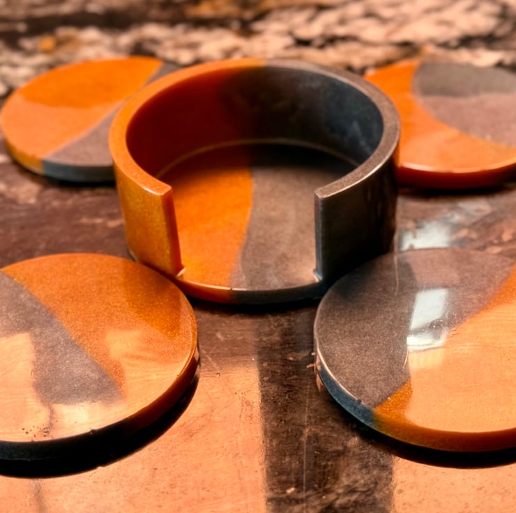 Now available in a sophisticated blend of graphite and copper, these coasters come with a matching coaster holder. Made from food safe resin, they look beautiful against woods and natural stone.