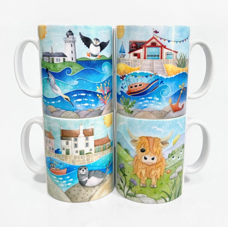 These cheerful, seaside ceramic mugs will add a splash of sunshine to your coffee table! Each mug features one of my whimsical watercolour designs of the East Neuk of Fife, printed on both sides. The mugs are dishwasher-friendly and printed in vivid, long-lasting colours!
