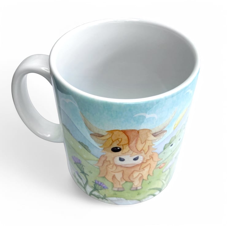 Highland Cow Mug - Scottish Highlands with Thistle - Watercolour Painting