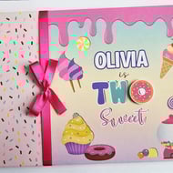 This First Birthday Guest Book is decorated with embellishments and a ribbon.