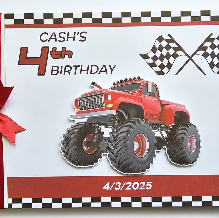 Monster trucks boys Birthday Guest book, red monster trucks birthday book