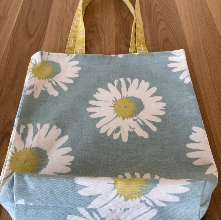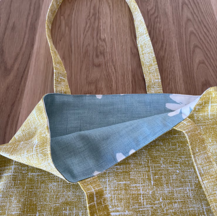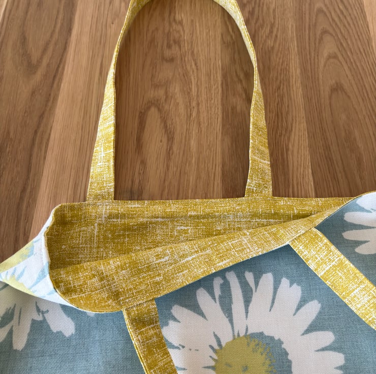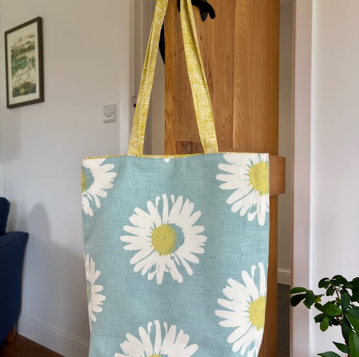 Handmade reversible tote bag in 100% cotton fabric. One side shows a fresh white and yellow daisy print on a mineral green background, the other side is a yellow and white woven print design. Strong fabric handles in yellow.
