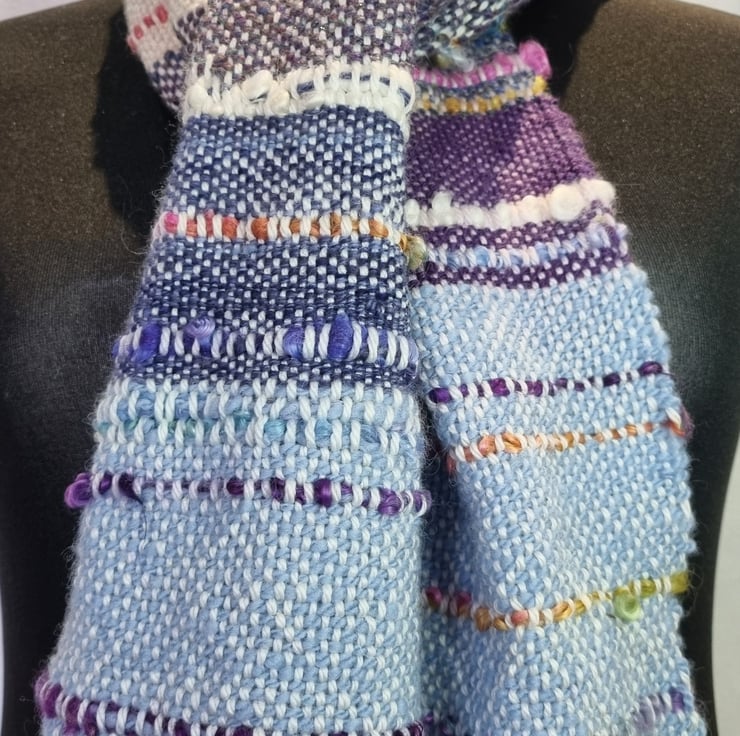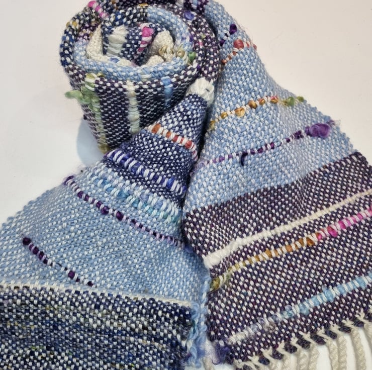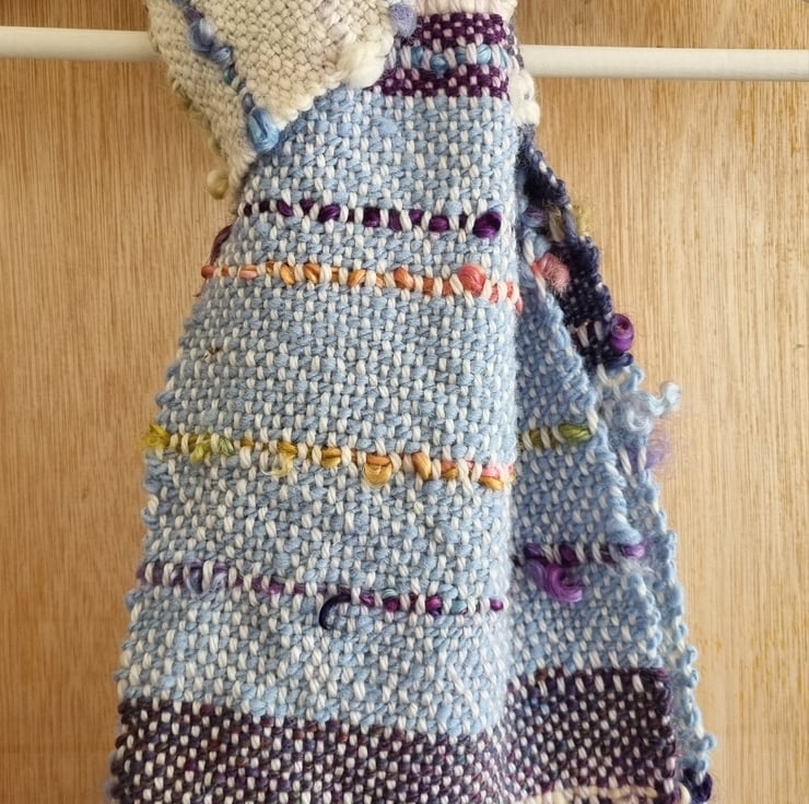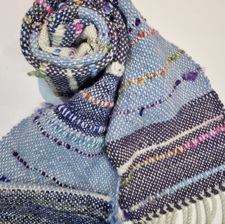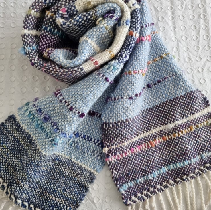 A beautiful hand woven scarf made from a mix of wool and sheep locks, woven in between for texture.