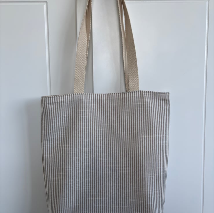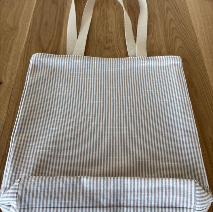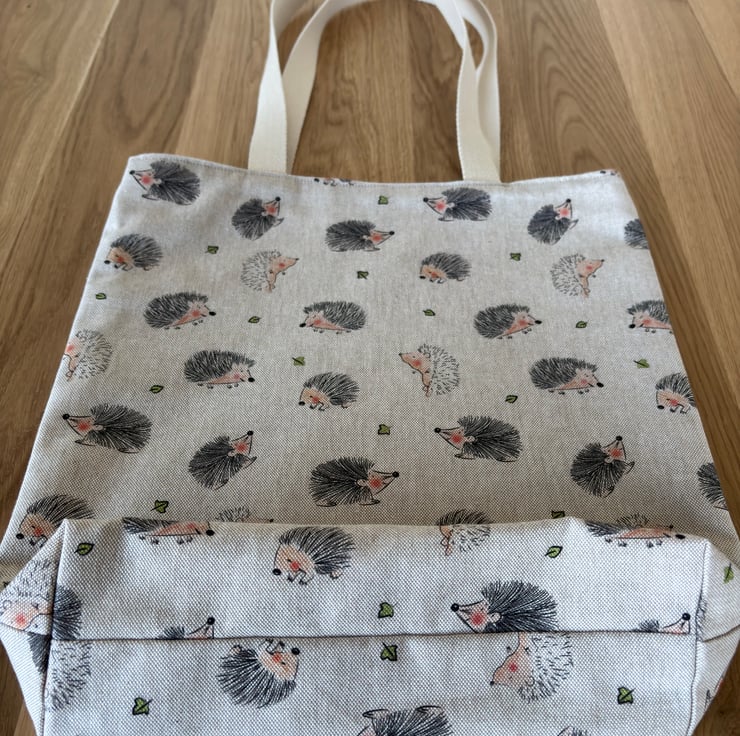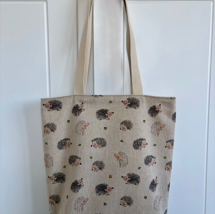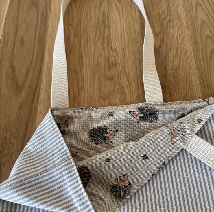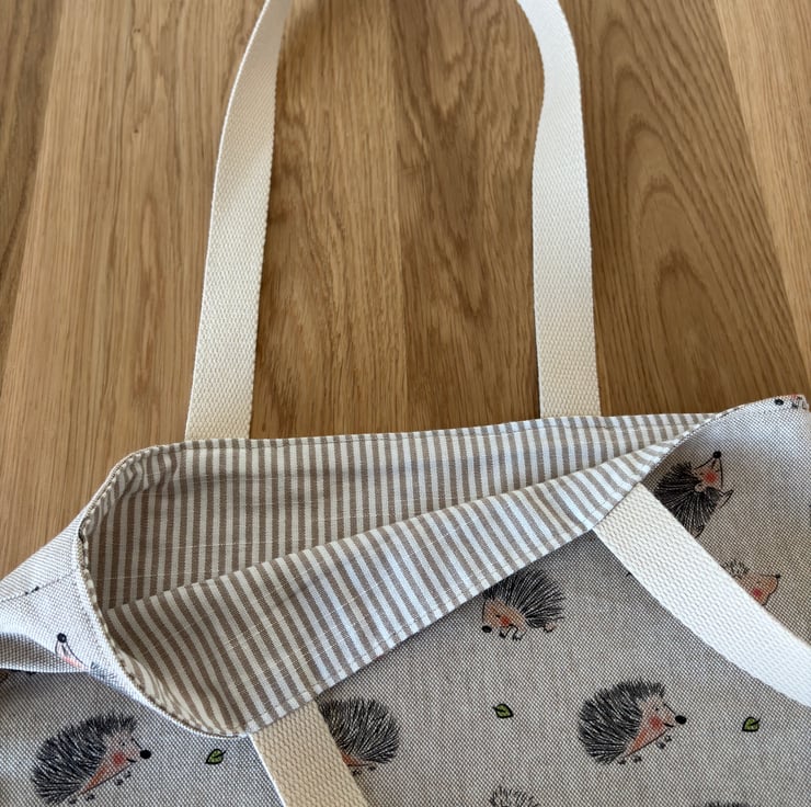 Handmade reversible tote bag. One side shows a fun print of happy hedgehogs on a cotton rich linen look fabric, the other side is a classic natural and cream stripe 100% cotton fabric. Strong cotton webbing handles.