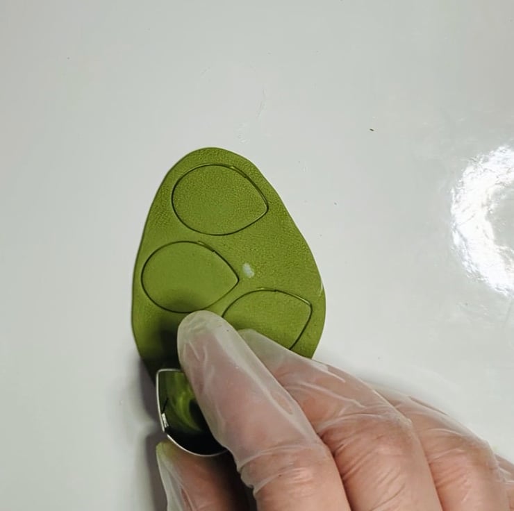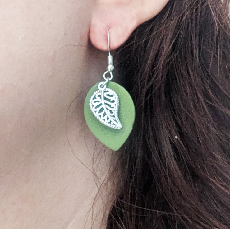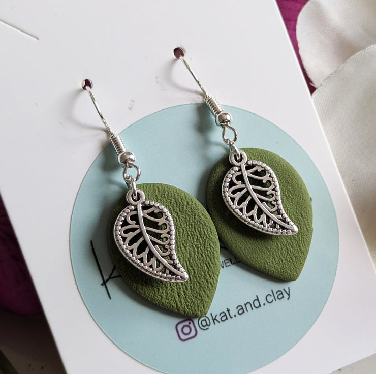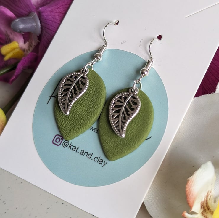 Ttextured green FIMO earrings finished with a leaf-shaped charm. The sage green is a custom, handmixed colour to get the perfect leafy green. The earrings have a light bumpy texture.