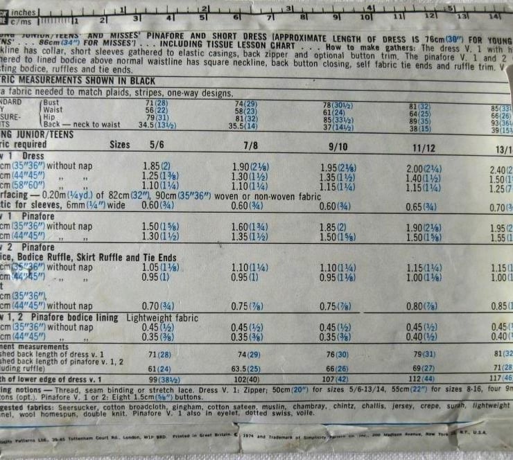 A vintage sewing pattern for a girl's short dress and pinafore in size 11/12 (bust 32"/81 cm, simplicity 6162). The dress with high round neckline has collar, short sleeves gathered to elastic casings, back zipper and optional button trim. The pinafore with skirt gathered to lined bodice above normal waistline has square neckline, back button closing, self fabric tie ends and ruffle trim. View 2 has contrasting bodice, ruffles and tie ends. The pattern includes an instruction sheet for making gathers. The pattern has been used to make the dress only. The pattern piece for the bodice front is slightly torn. The pattern is dated 1974.