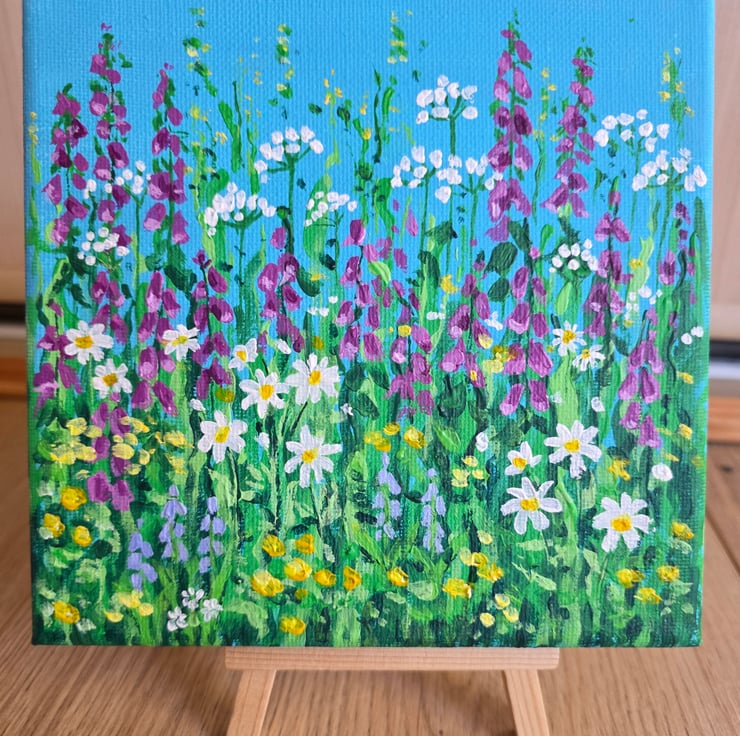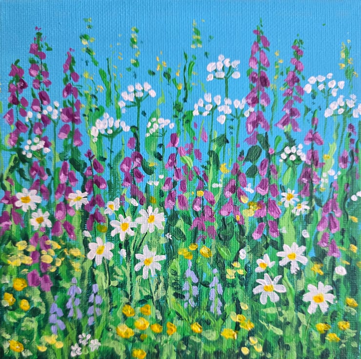Foxglove paradise is a small mini-canvas created in acrylic paint by Elaine Curtis. This abstract floral painting features a profusion of foxgloves growing with a variety of other flowers.