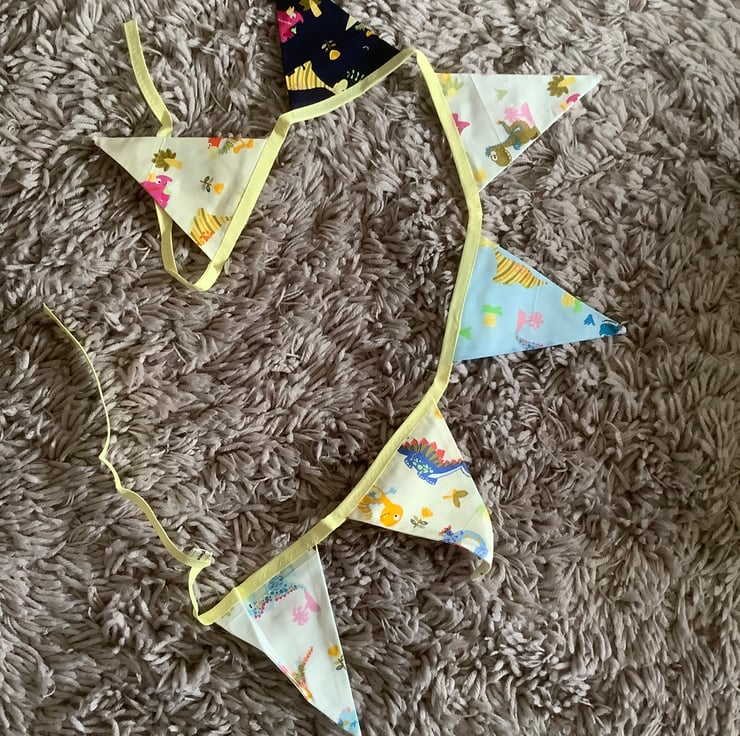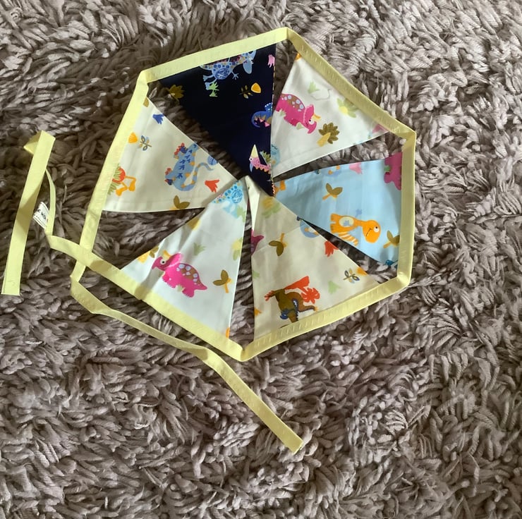 Cute little dinosaur bunting on a yellow tape approximately 3’6” long each double sided flag 4.5” x 6”