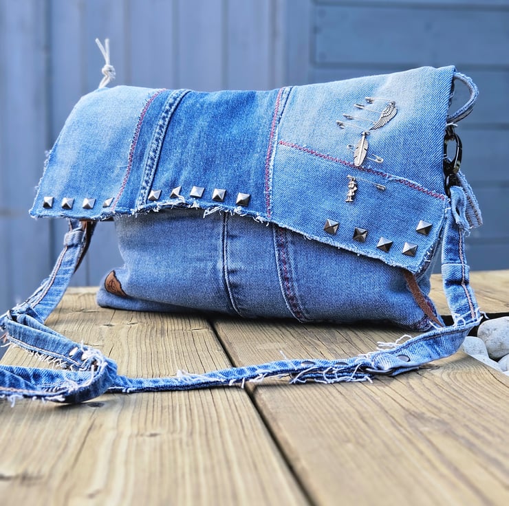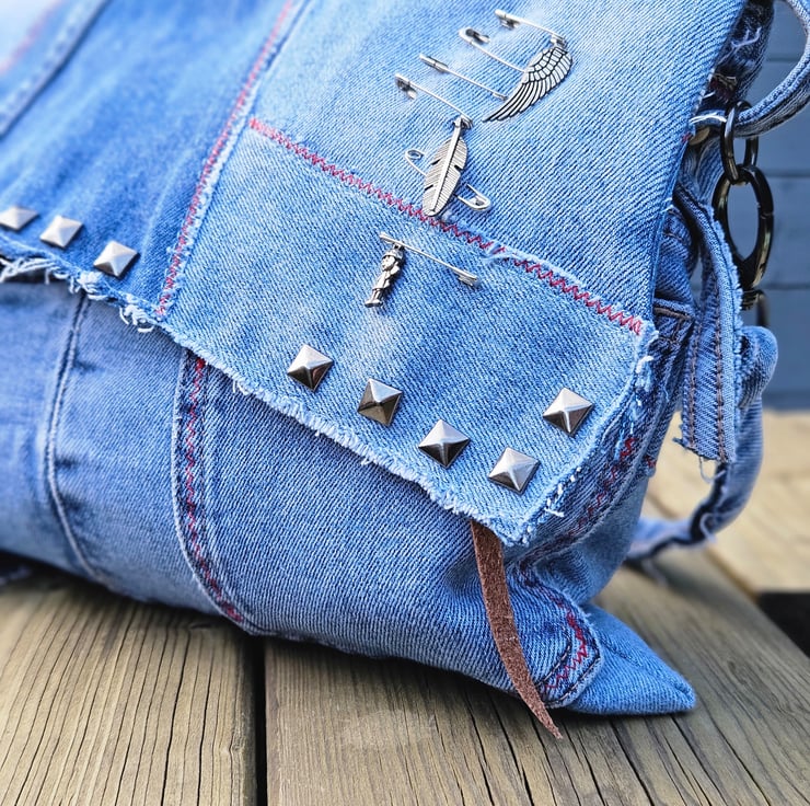 Upcycled Denim Messenger Crossbody, Sustainable Jeans Handbag, Rock Gothic Punk
