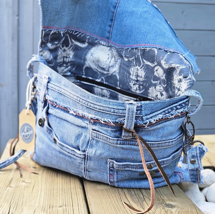 This meticulously crafted piece showcases the beauty of upcycled denim. The unique skull lining adds a touch of edgy flair. It's a statement piece for those who appreciate individual style. The repurposed denim gives new life to a classic material. This item is perfect for anyone looking for something distinctive and sustainably made.
