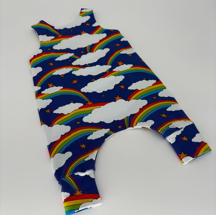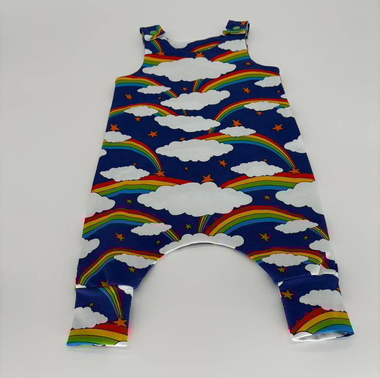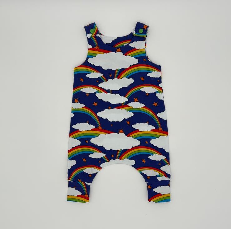 Bright and bold rainbow print dungarees with matching cuffs and plastic snaps.