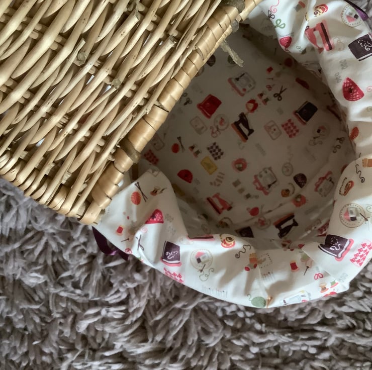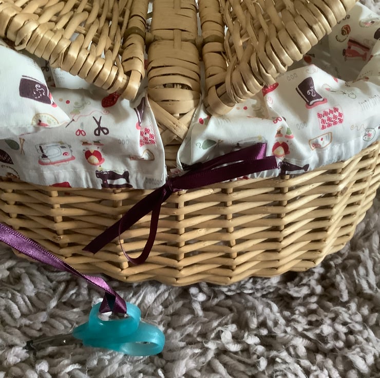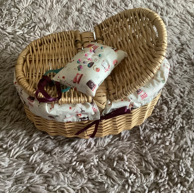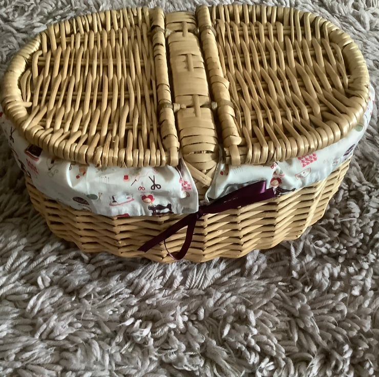 Vintage basket moderised into an up to date sewing basket complete with pin cushion and scissors. Lined with sewing themed fabric the basket is oval shaped with twin lift up lids. Measures approximately 12” long and 8” wide at the widest points.
