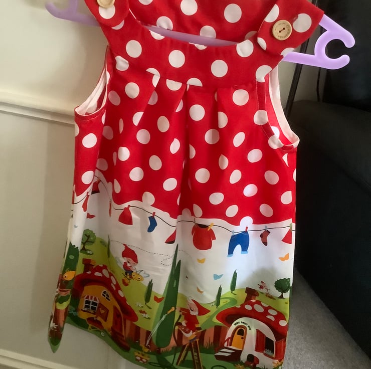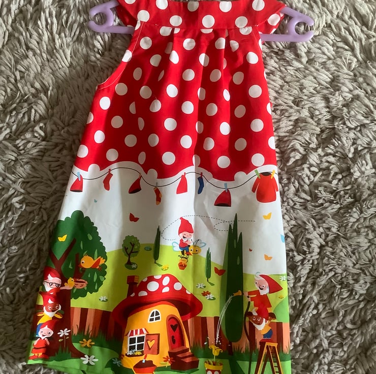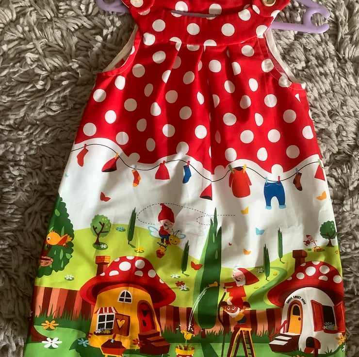 Cute gnome fabric dress. Bright and vibrant border fabric featuring cute little gnomes and toadstool homes. Red polka dot top wit wooden style buttons. Probably aimed at a 4 - 5 year old but measures 13” across chest (measured at bottom of armholes) and length 23” from shoulder to hem (generous 2” hem turned up so room to grow)