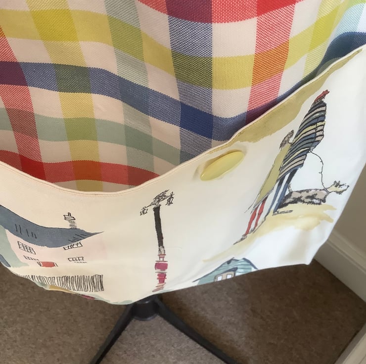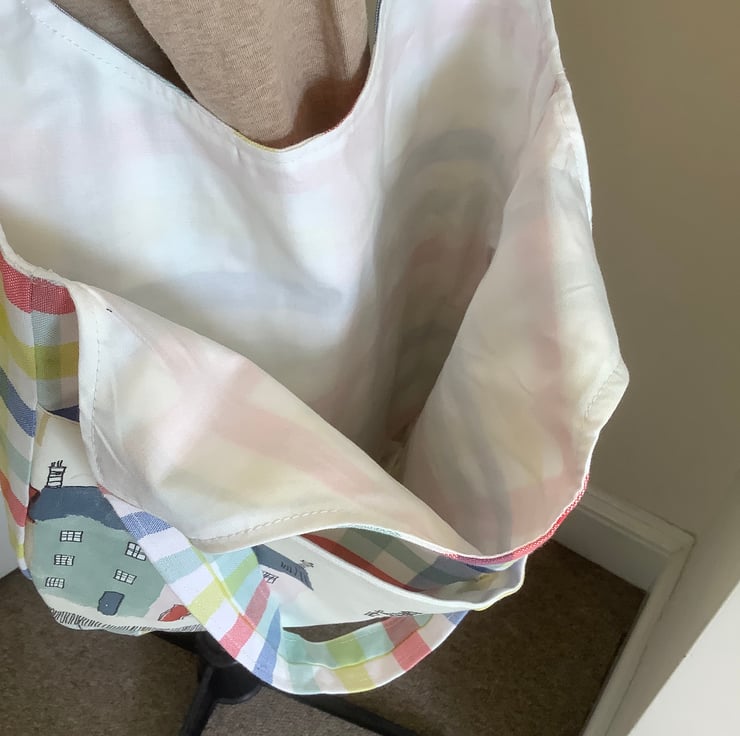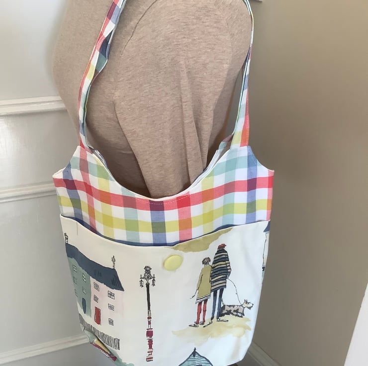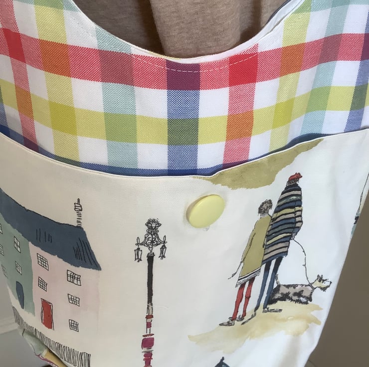 Cream canvas couple print front on a multi coloured fabric base. Nice long handles and fully lined. Front pocket panel is fastened with a lemon retro style button measuring approximately 14” deep and 14” wide