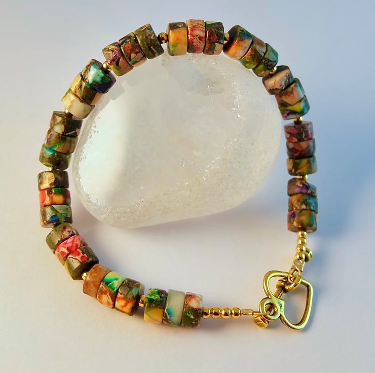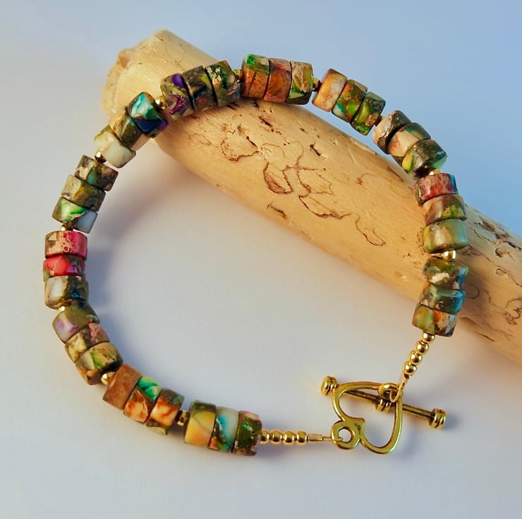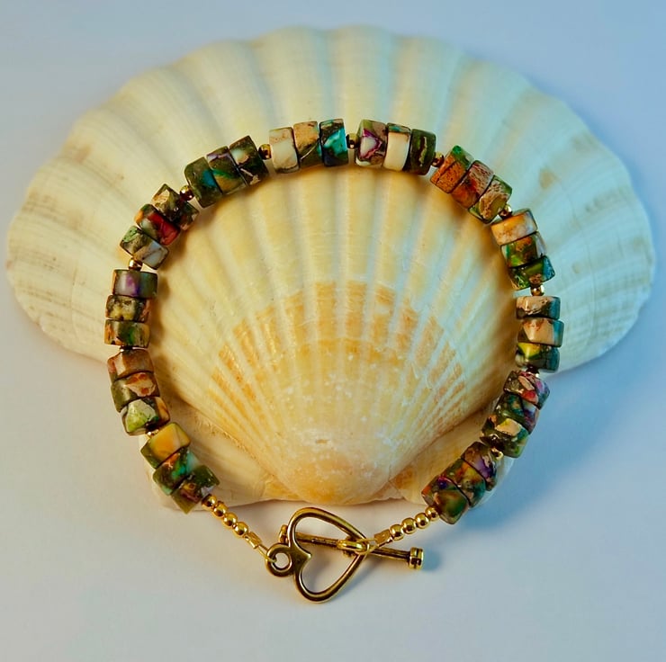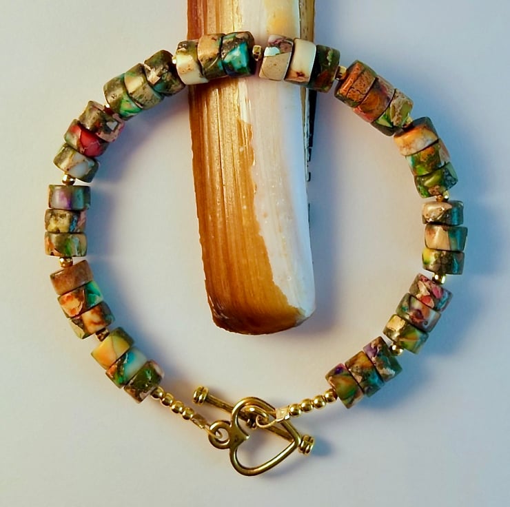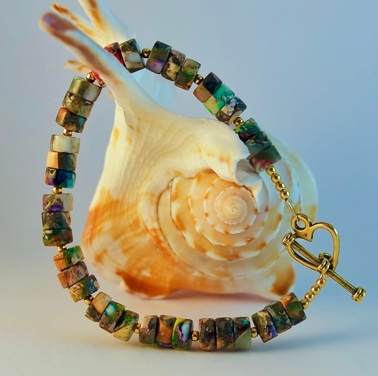 The bracelet fastens with an antique gold heart shaped toggle clasp which is nickel and lead free.