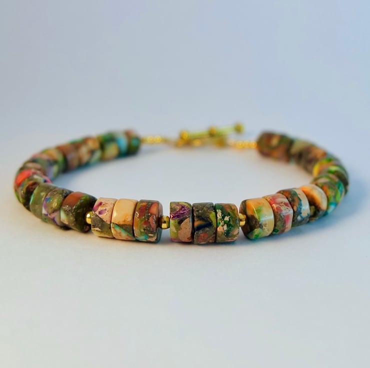 Mostly green in colour, these Imperial Jasper Heishi beads are speckled with vibrant colours of creams, blues, pinks and reds.
