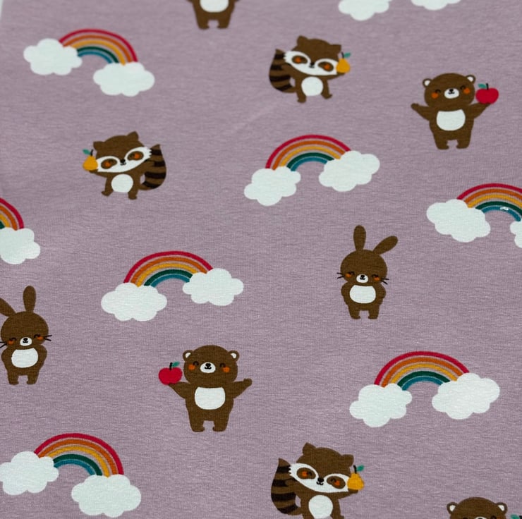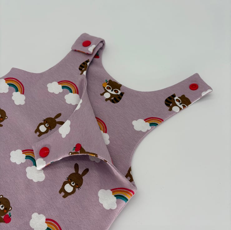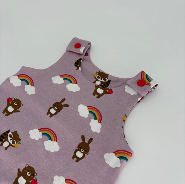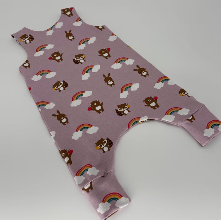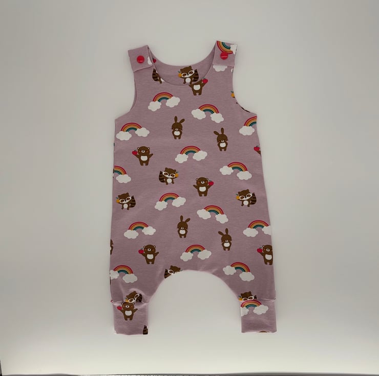 Handmade dungarees in a fun print featuring rabbits, raccoons, bears and rainbows on a raspberry pink background with matching cuffs. In various sizes.
