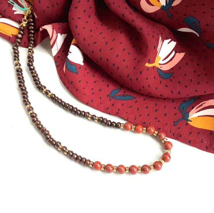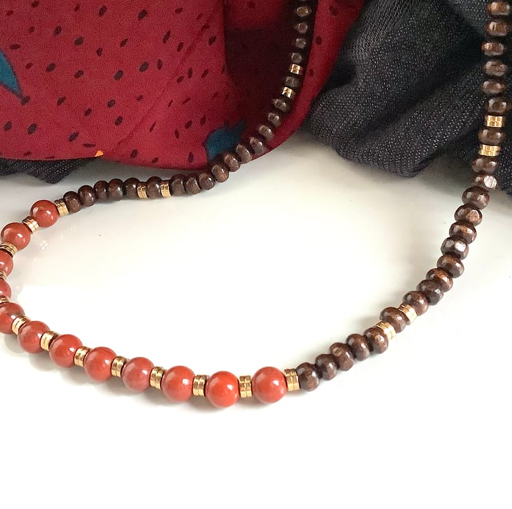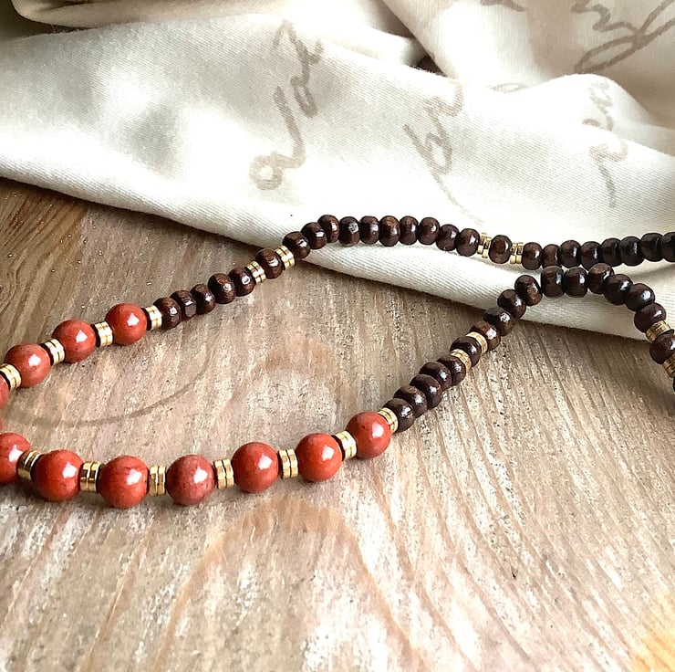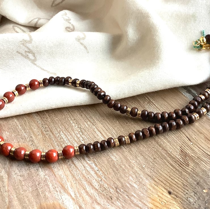 Gorgeous goldstone and gold hematite beads with earthy wooden beads