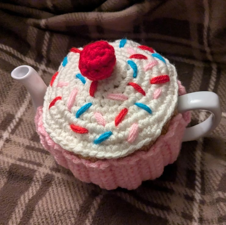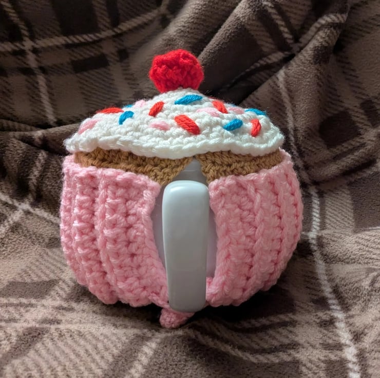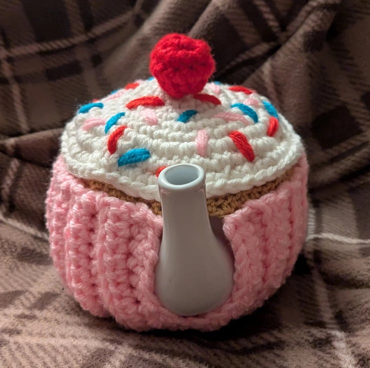 Novelty tea cosy crocheted in acrylic DK yarn tripled for thickness, this cupcake style cosy with sprinkles and a cherry on the top is a perfect gift for someone who loves tea and cake.