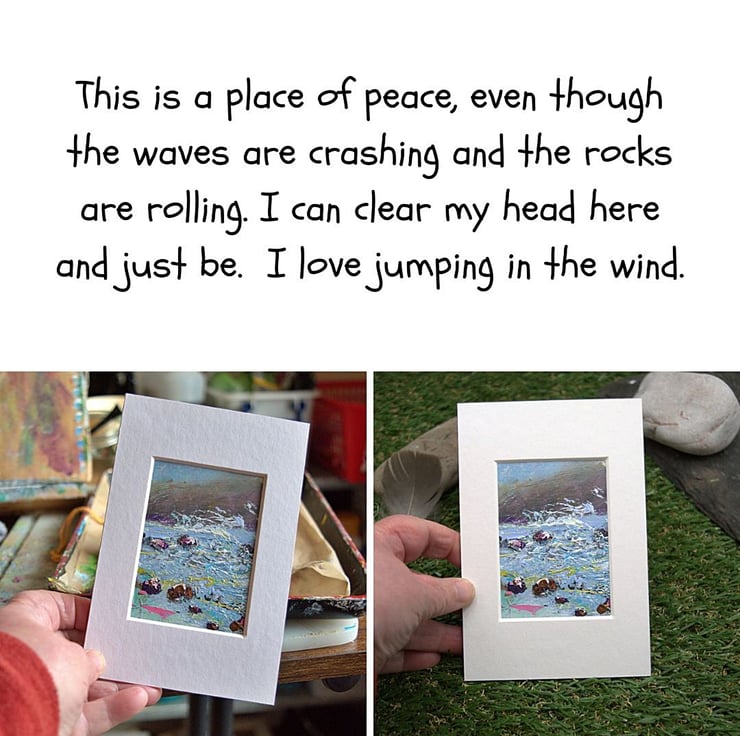 (57) The inspiration for this small painting is the joy of being outside when the elements are wild and you have to fight to catch your breath. I've called this, 'Jumping In The Wind.' It will make an ideal gift for any art or nature lover.