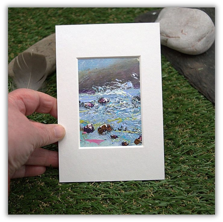This is a small original seascape painting. The waves are choppy and crashing on to the shore. In the distance rests a hillside that is out of reach. The rocks are gripping on to the sand to avoid being swept away. I have used a combination of brushes and knives to apply thick layers of acrylic paint on to the sealed paper. It will make an excellent letterbox gift.