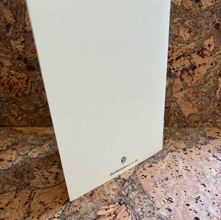 I love to photograph the everyday from different angles and try to notice things that might otherwise be missed. Each card print is unique, one of a kind, produced from a photograph, scanned, adjusted and resized. Printed on 180gsm recycled Bristol board either using eco friendly ink or thermal ribbon which is re-used or recycled. The whole process is a creative experience, I never start out with a finished idea but instead allow the piece to naturally form.