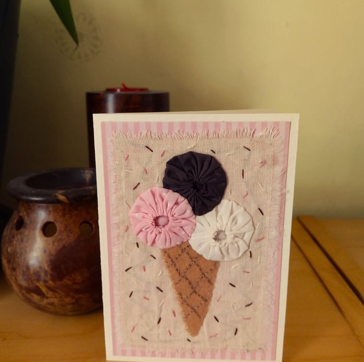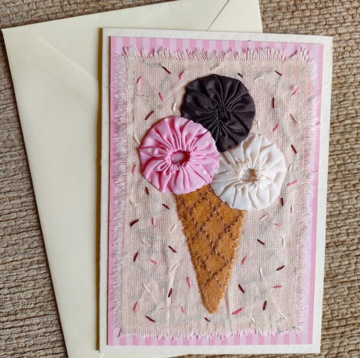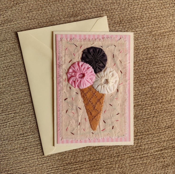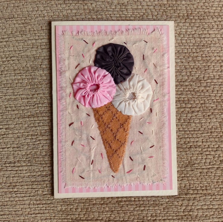 Hand-stitched greeting card featuring a neapolitan style ice cream cone design.