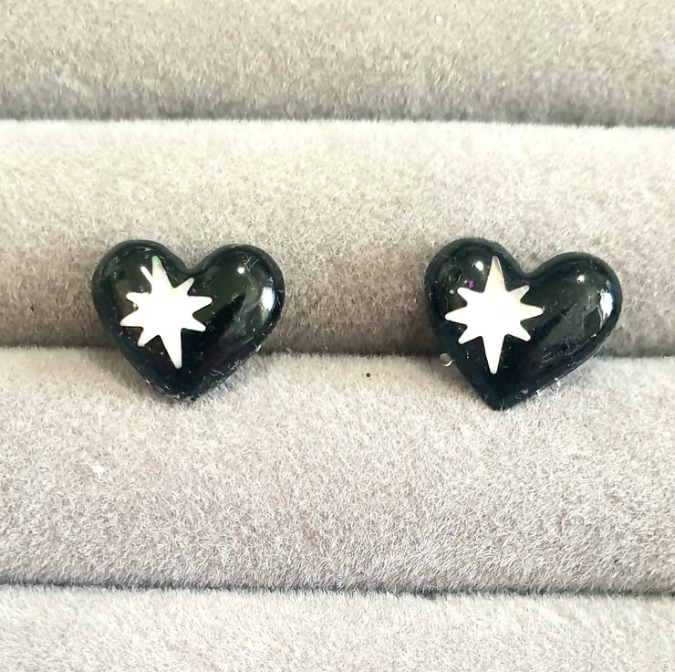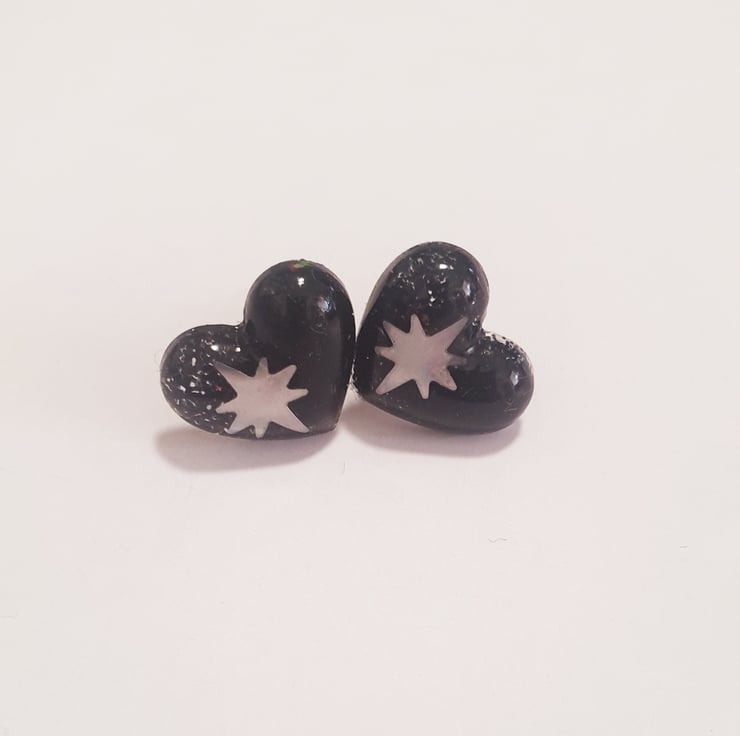 Clear resin with star inclusion studs backed with black glittered resin. Stainless steel hypoallergenic stud posts.