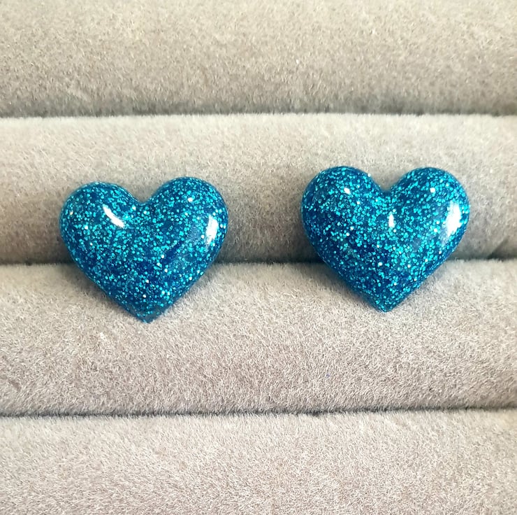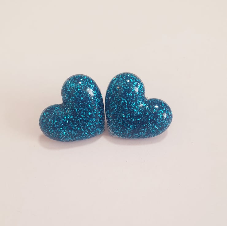 Sky blue resin glitter heart stud earrings. Stainless steel hypoallergenic stud posts.