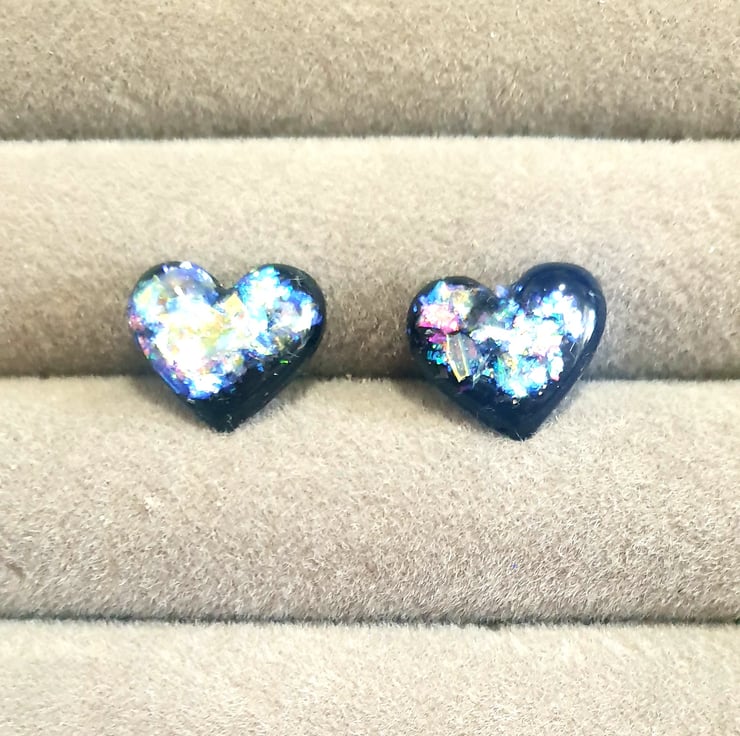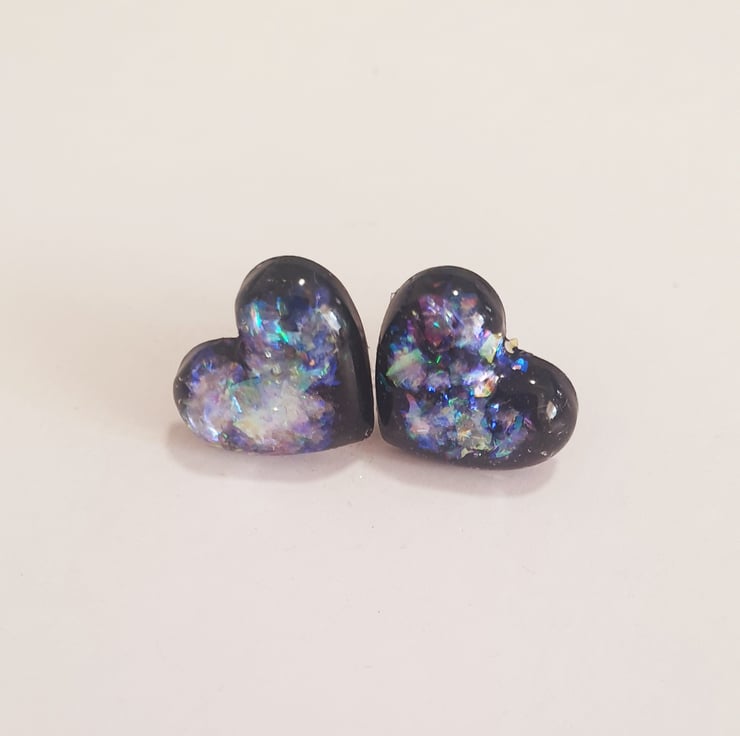 Resin glitter heart stud earrings. Stainless steel hypoallergenic stud posts.