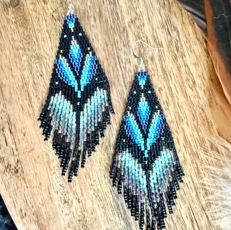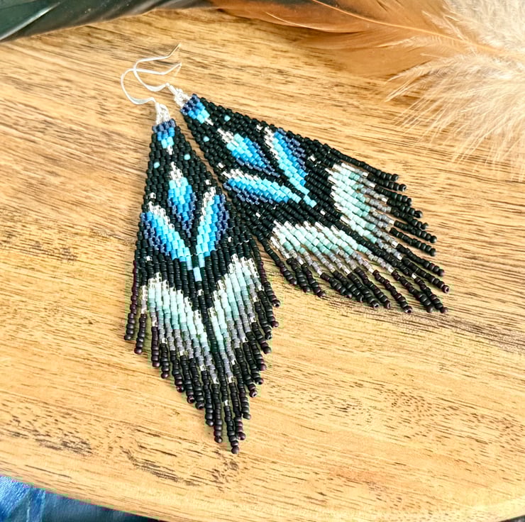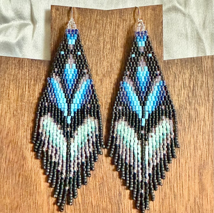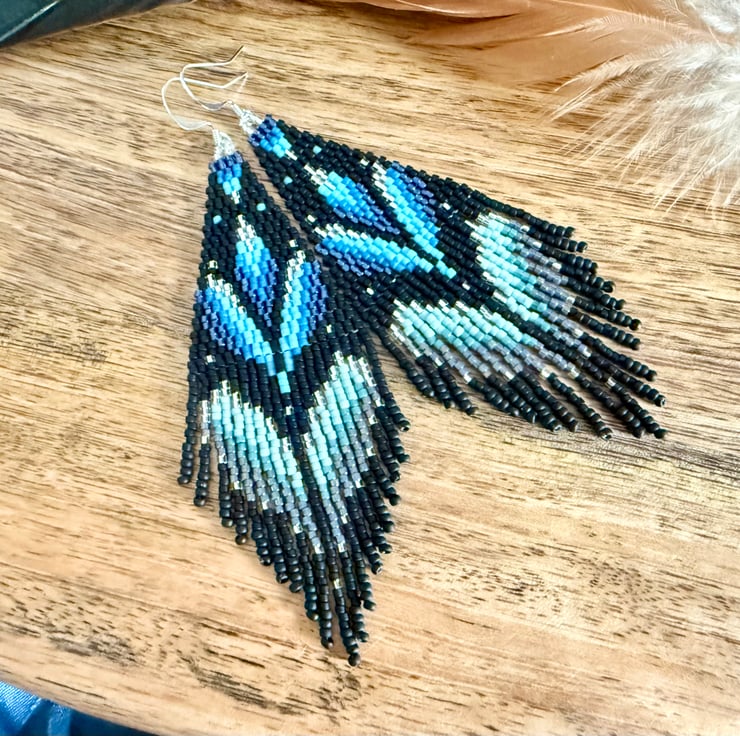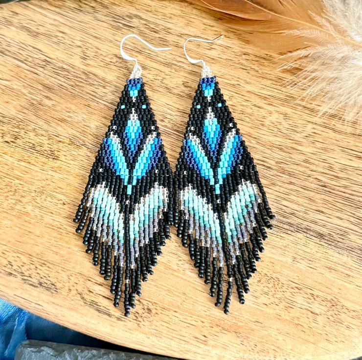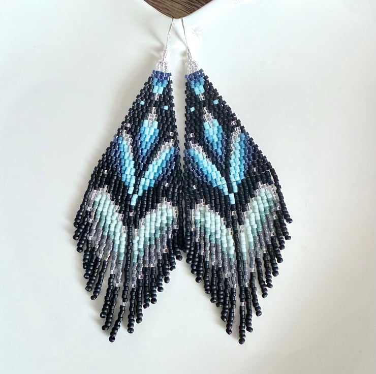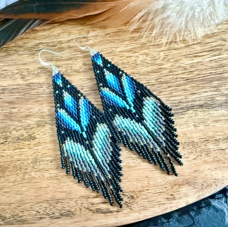 These bead woven earrings have been handmade with tiny Japanese Miyuki beads in an assortment of colours. The pattern is a lily flower with blue petals and green leaves. The petals are hand woven in double rows into the top triangle section in 3 different shades of blue and the leaves have been created in the beadwork fringe that hangs below, and these are in 3 different shades of green. The background colour for this earrings is made up of matt black beads.