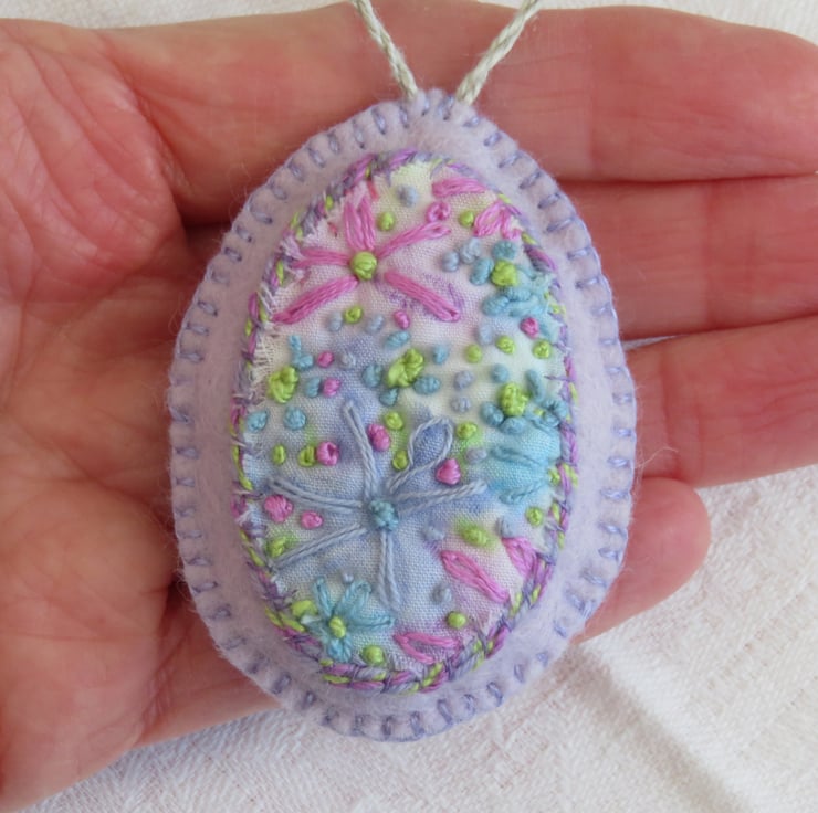 Eggs shapes have been cut from pastel coloured felt. A panel of hand painted fabric, in a floral design, in colours to compliment the eggs, has been stitched to the 'front' of each egg and embellished with hand embroidery. The decorated front panel has been blanket stitched to a matching, plain back panel and the egg has been lightly stuffed. A hand made linen cord has been stitched to form a hanging loop.