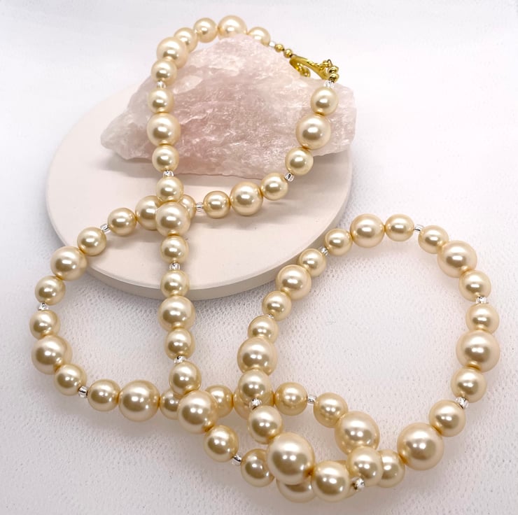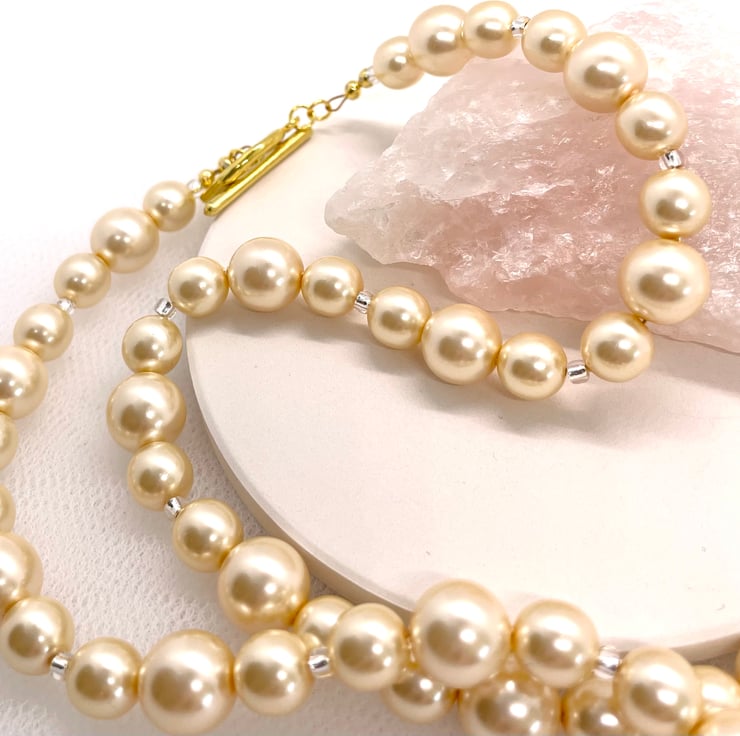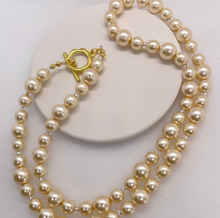 Beautiful rich cream glass pearl necklace completed with a gold plated hexagon toggle fastening. Two sizes of pearls are used, 10mm and 8 mm.
