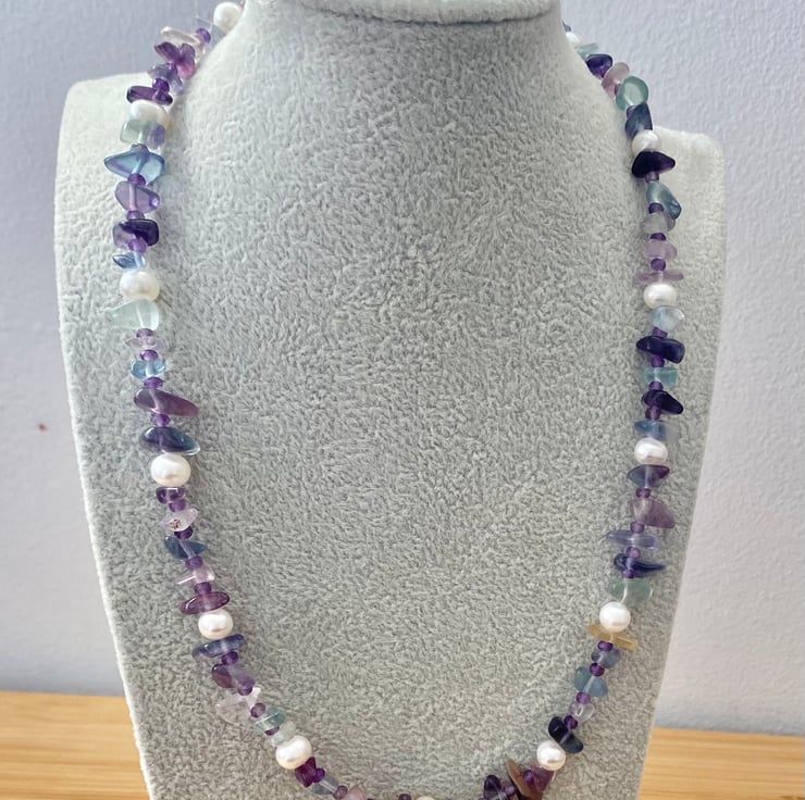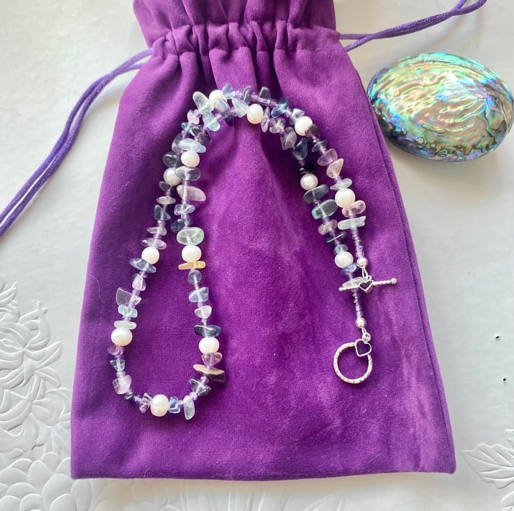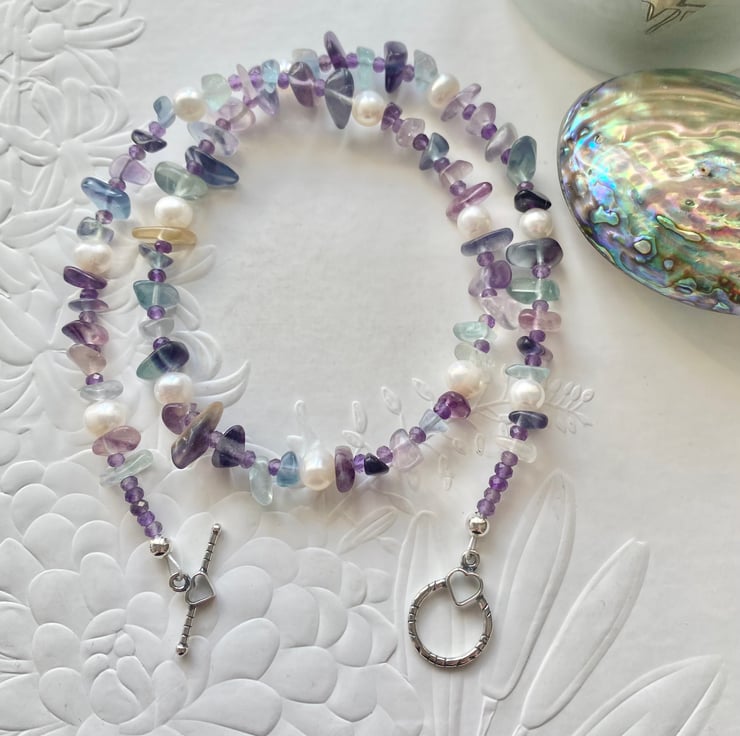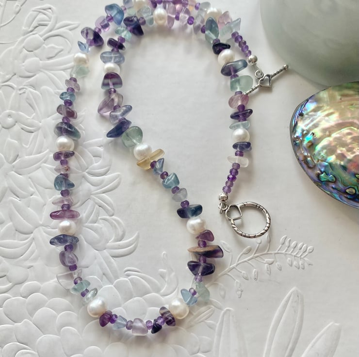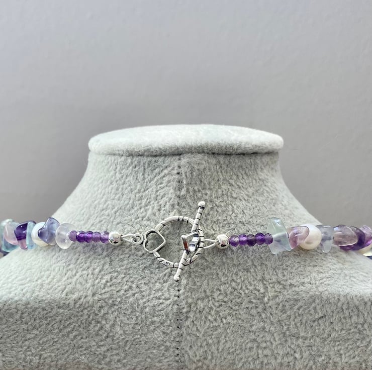 An absolutely stunning handmade necklace featuring Fluorite nuggets, faceted Amethyst rounds and white freshwater cultured Pearls. I have finished the necklace with an etched 925 sterling silver toggle clasp, with a lovely heart detail, making it extremely easy to fasten.