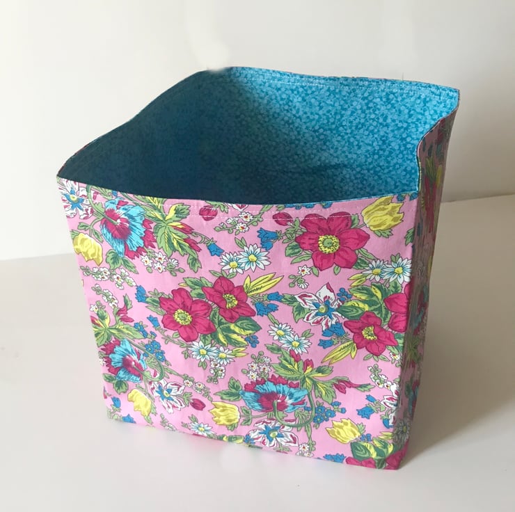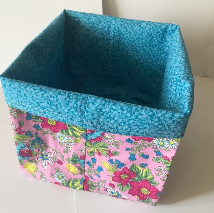 Fabric Storage Box Blue and Pink Floral Cotton Reusable Storage Caddy