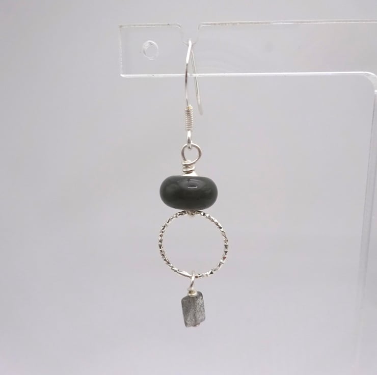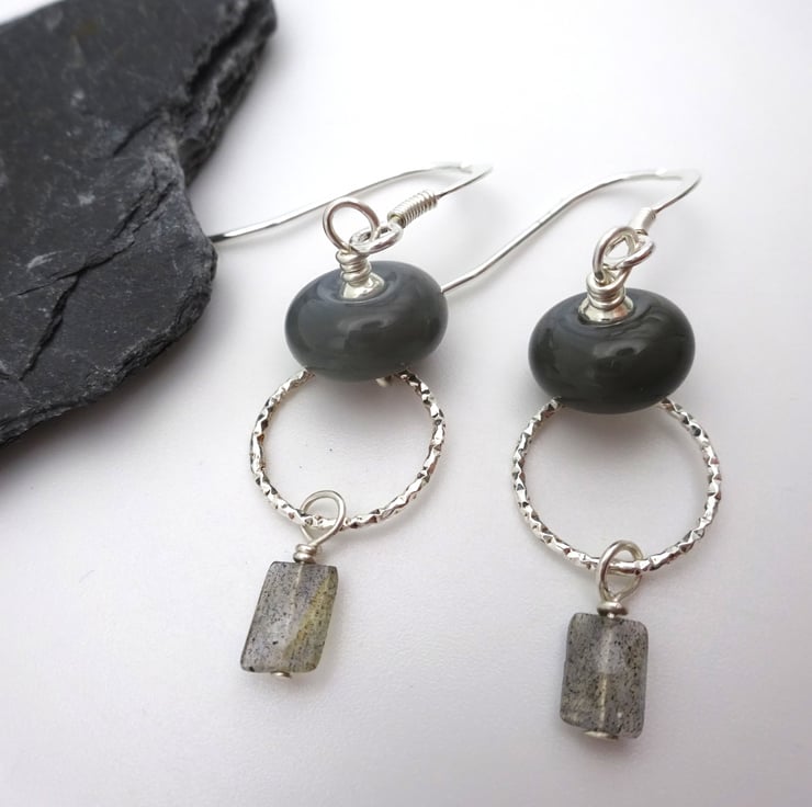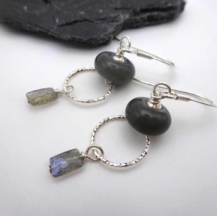A pair of earrings made with sterling silver ear wires, grey handmade lampwork glass beads, sterling silver rings and Grade AA labradorite gemstone beads.