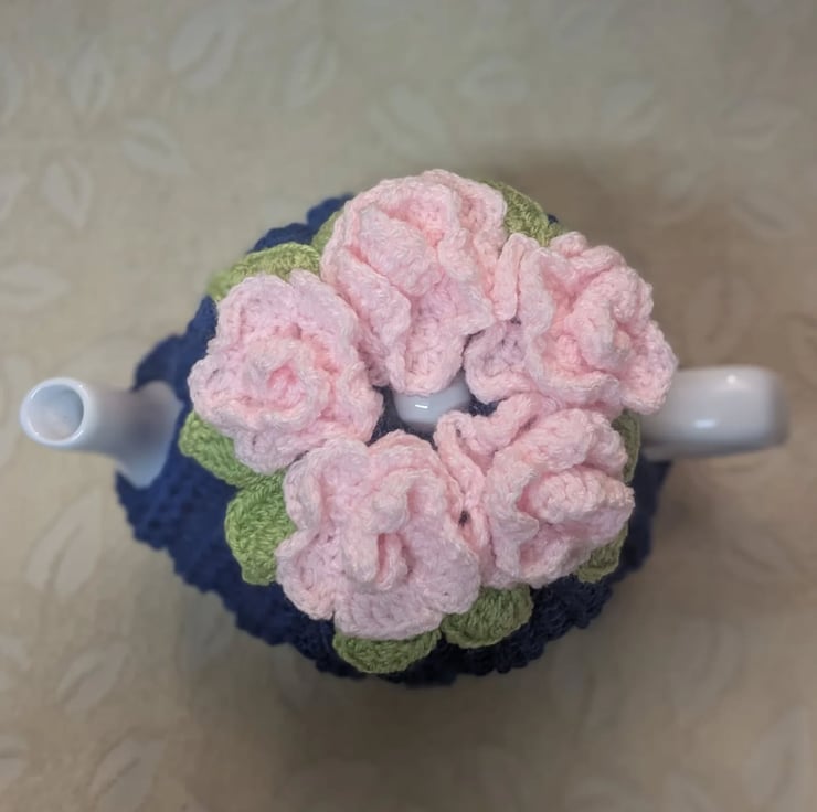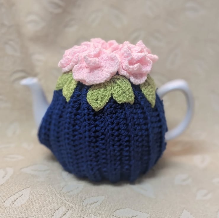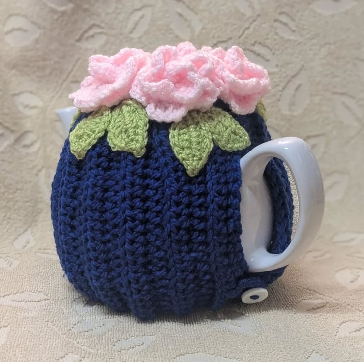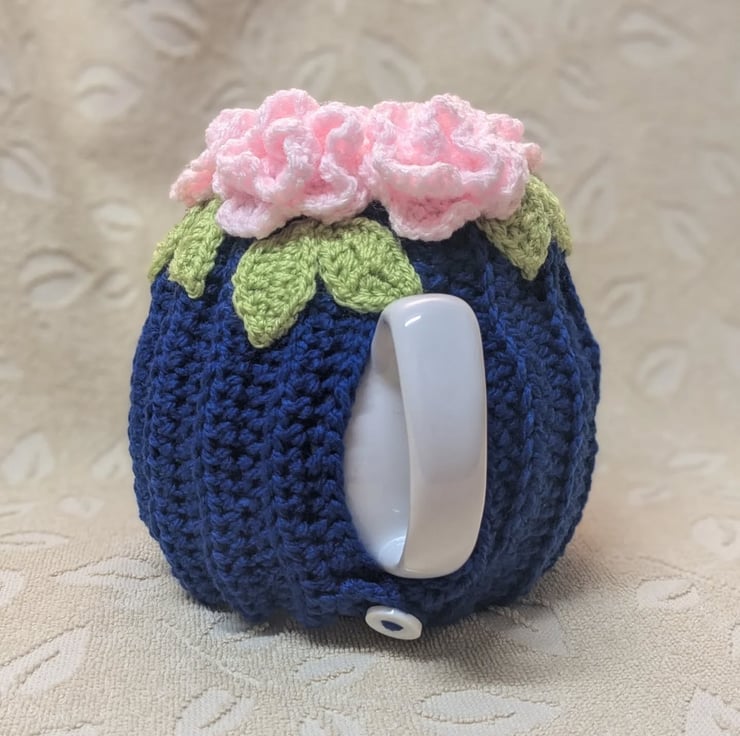 Shabby chic, vintage look tea cosy crocheted in royal blue acrylic DK yarn with appliqued leaves and pale pink rolled flowers.