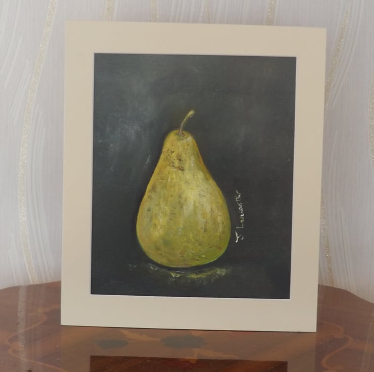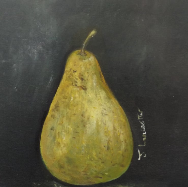 A solitary pear is depicted against a dark background, showcasing detailed textures and a subtle play of light and shadow. The pear's earthy tones contrast with the deep backdrop, enhancing its presence and realism .painted on a 10in x 12in canvas panel