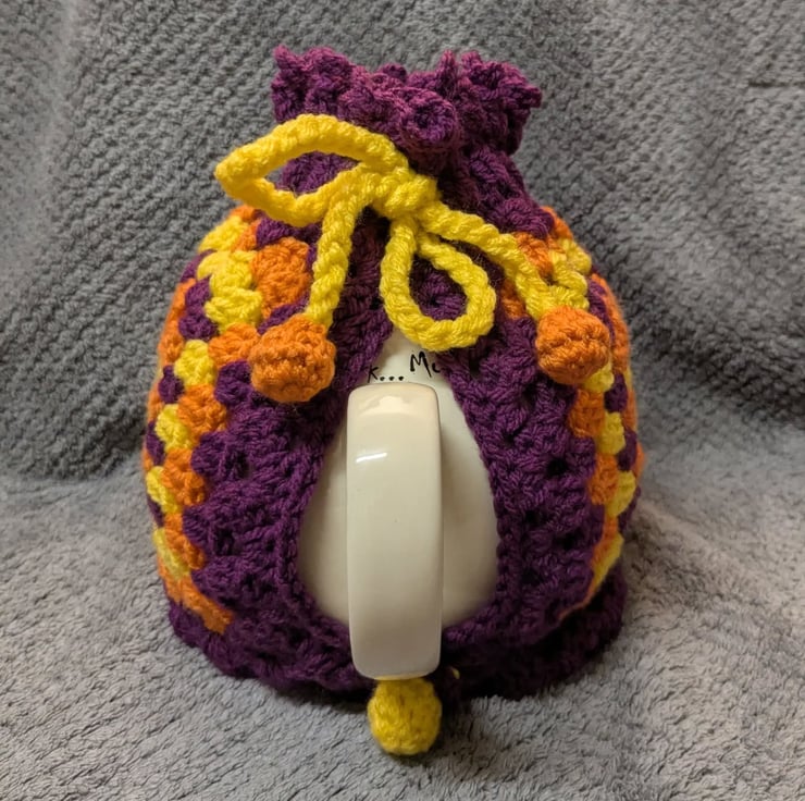 There is an opening for the spout and a flap at the back for the handle with a crocheted bobble fastener. The top is pulled closed with a drawstring featuring crocheted bobble ends.