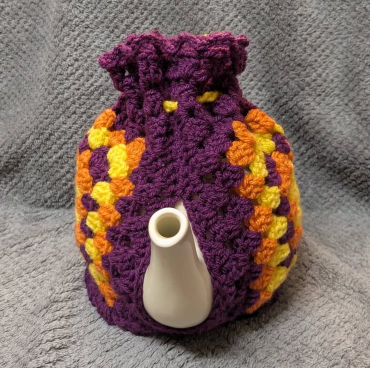 Shabby chic, vintage look tea cosy crocheted in retro granny square style using acrylic DK yarn. This one in yellow, burnt orange, purple with a purple border.