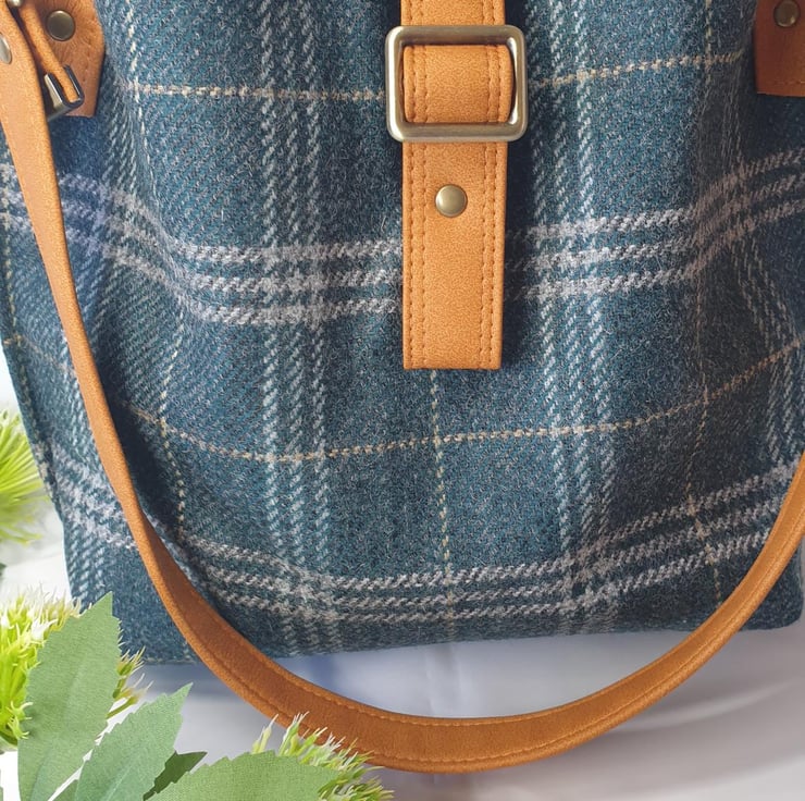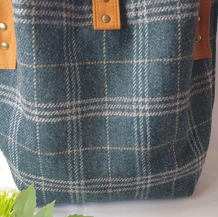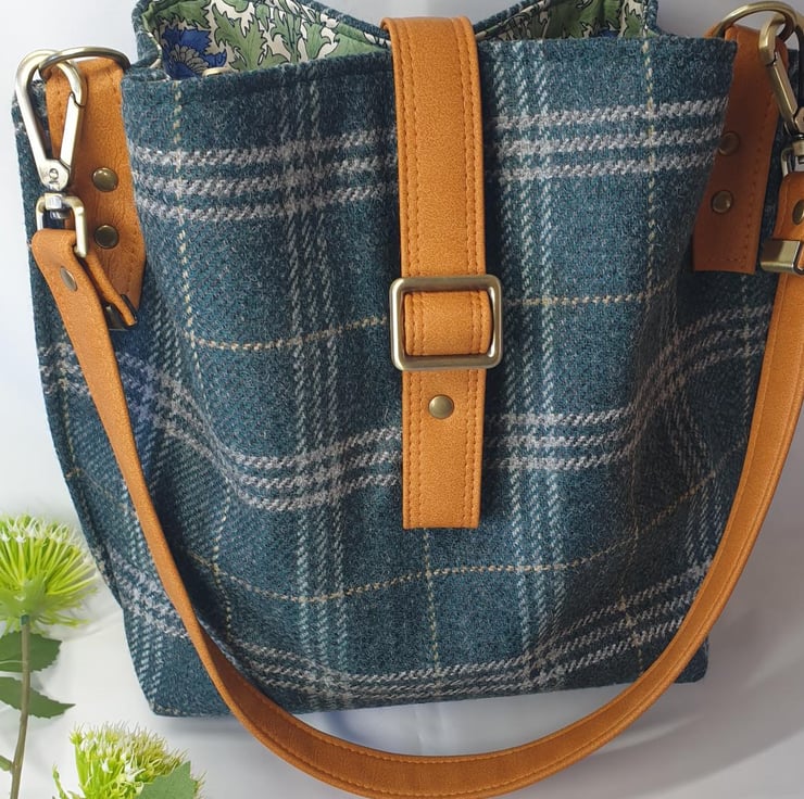 Beautiful Yorkshire tweed Hinterland handbag / shoulder bag in Cedar Grove check. Made from 100% wool with a mix of cotton and tweed interior fabric, this is a slouchy bag, has 5 pockets which includes 2 slip pockets and a centre zip pocket, and is secured with magnetic clasps. It has Mora luxury faux leather trims in Pumpkin Spice and a matching faux leather carry handle.